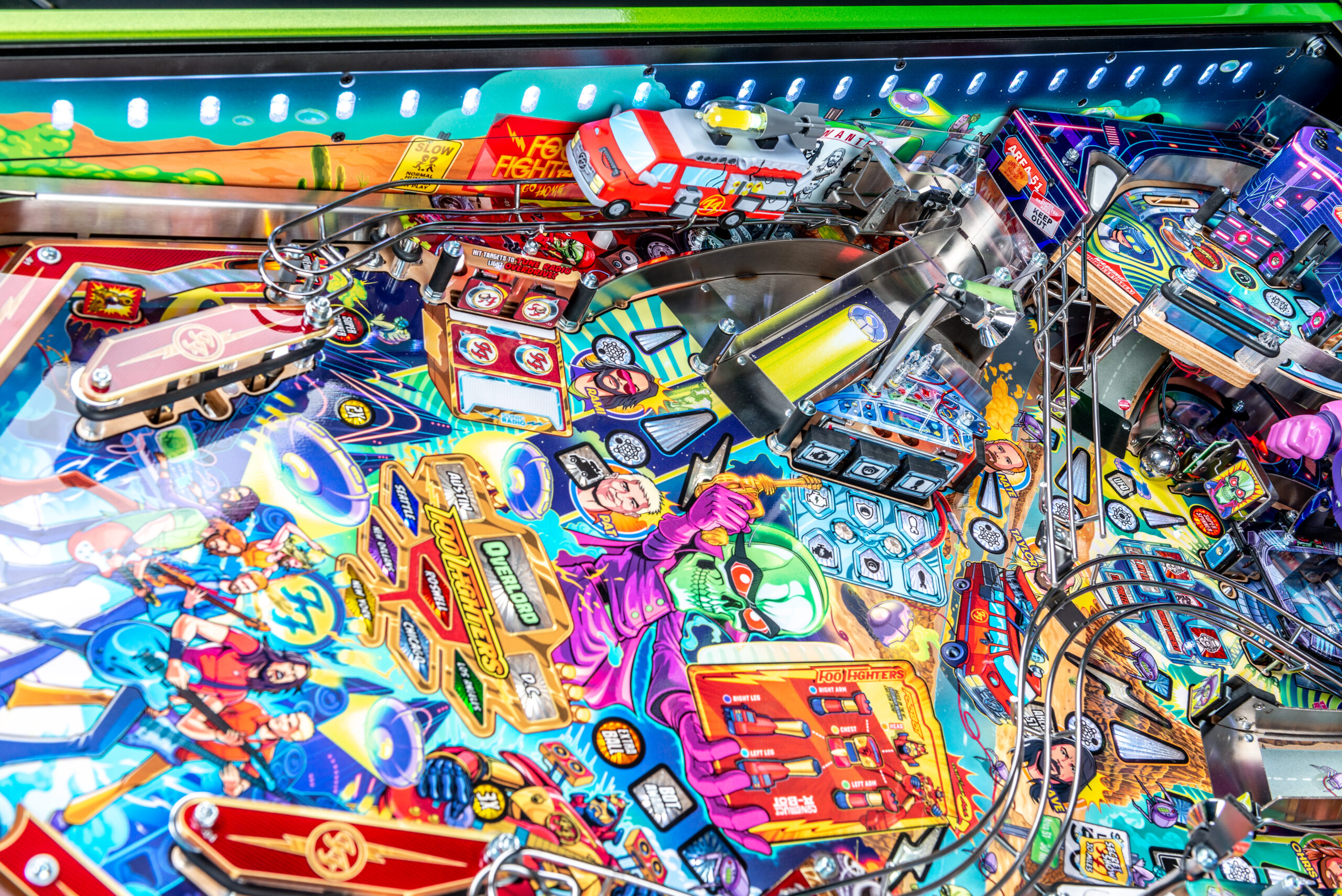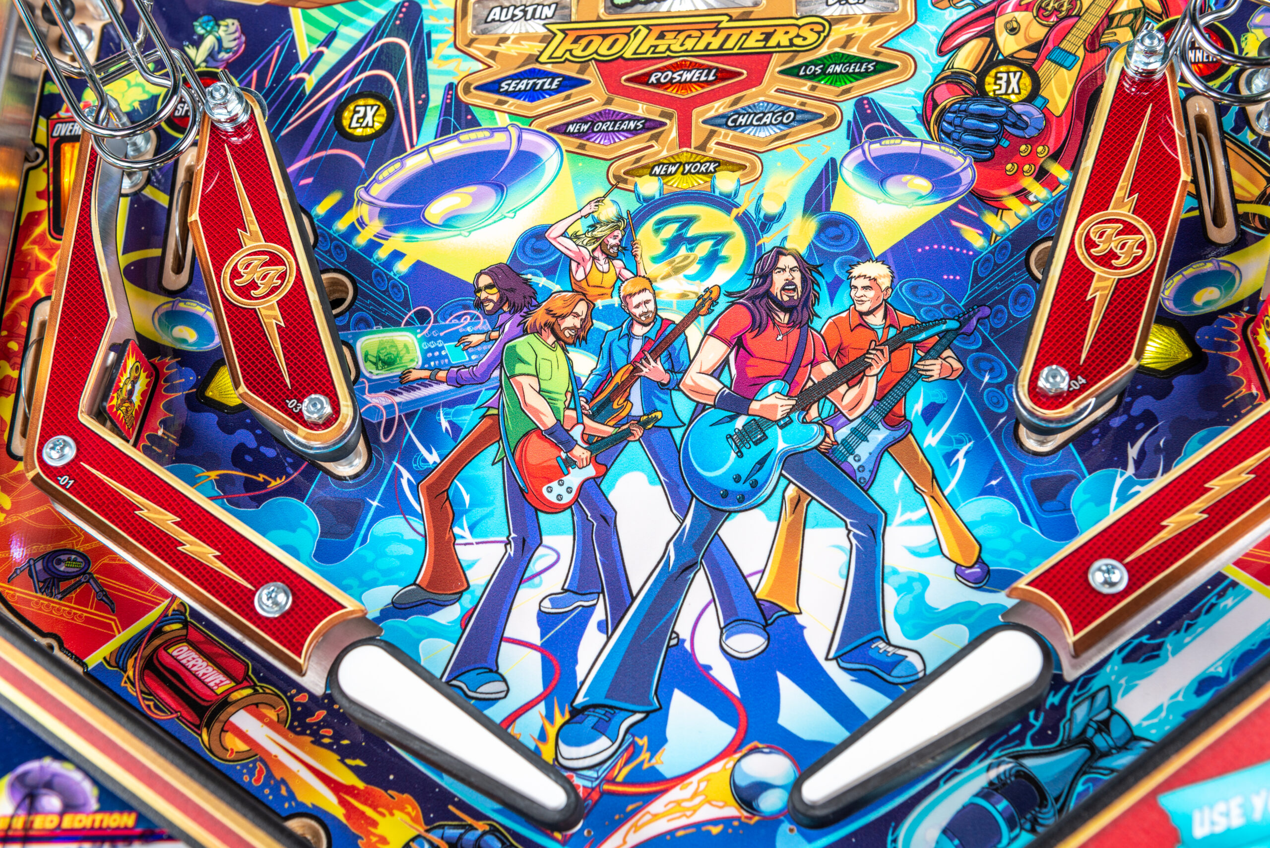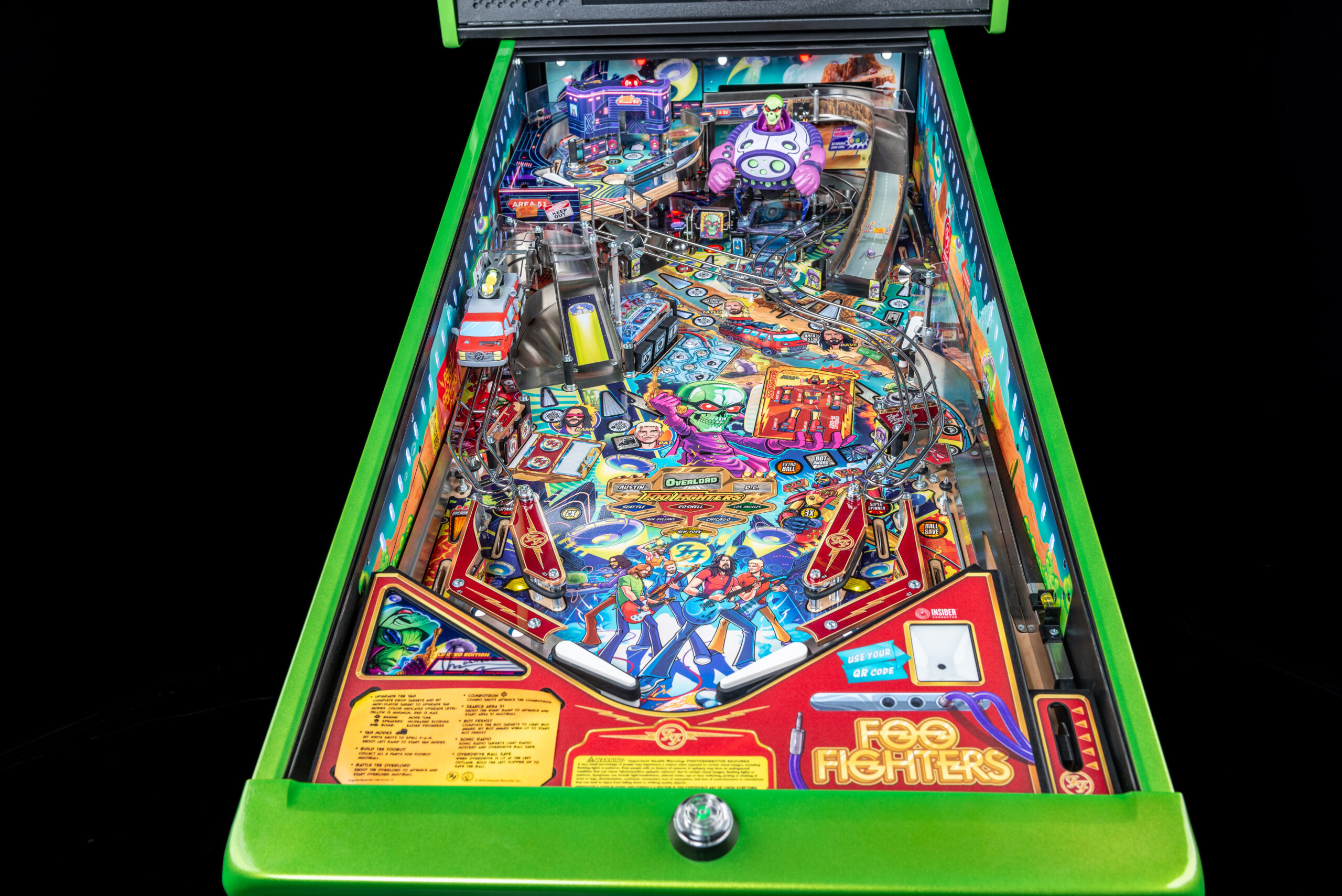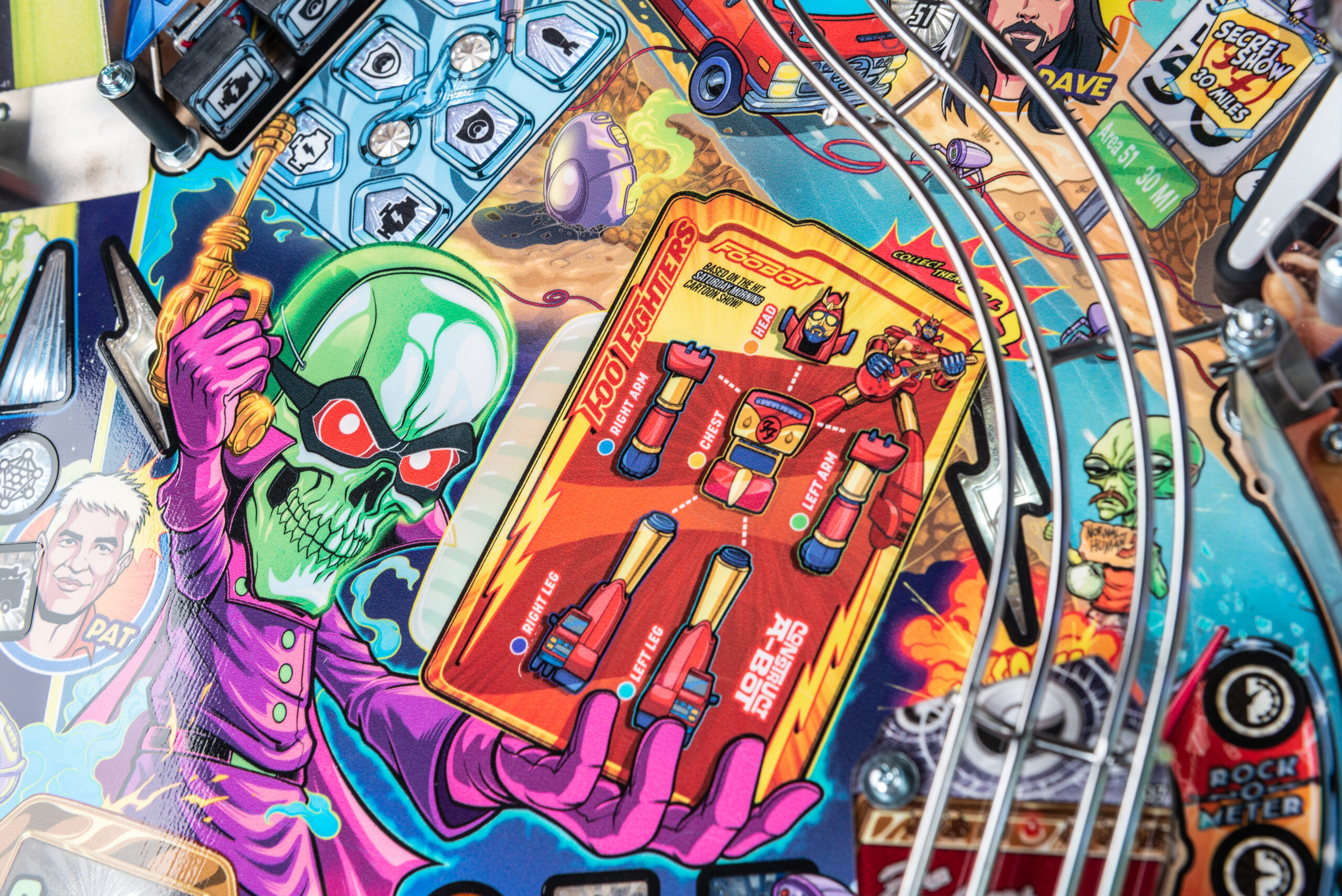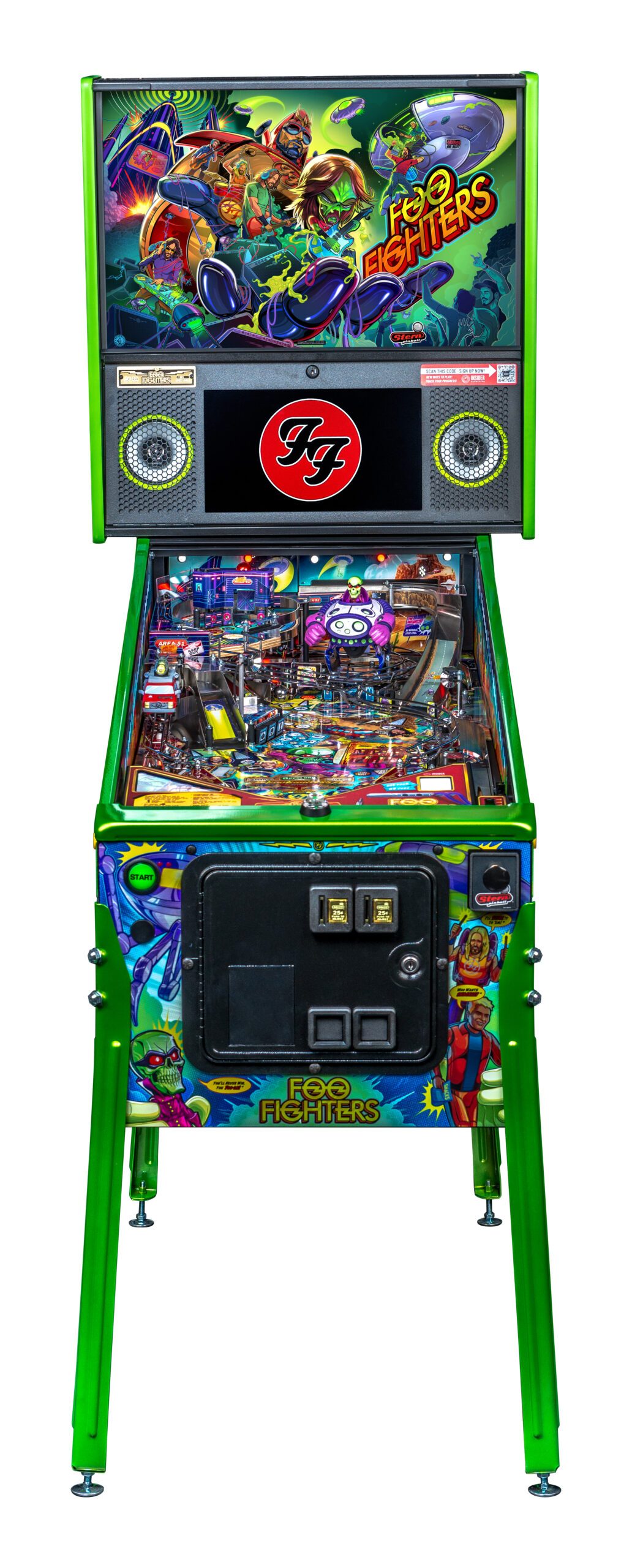 More than two years in the making and with creative input from the band’s own Dave Grohl, Nate Mendel, Pat Smear, Chris Shiflett, Rami Jaffee, and the late, great Taylor Hawkins, Stern’s Foo Fighters is a top-shelf pinball machine—and so much more. An entire new universe has been developed with jaw-dropping hand-drawn artwork and custom animations including “Foo Fighters Saturday Morning Action Time!”—a fictional TV series chronicling the band’s quest to save rock and roll… AND THE WORLD!  Join Foo Fighters on this rescue mission to thwart the evil, mysterious alien Overlord and his army of bots.  Search the Area 51 upper playfield to break into and unleash pinball chaos.  Jump in the van for a righteous tour of duty to save humanity from extinction and let rock rule!