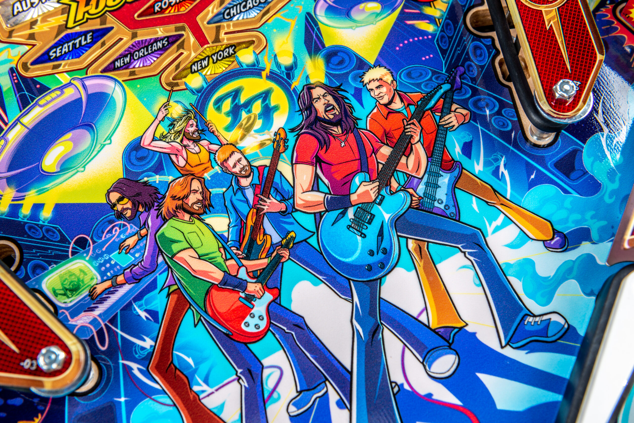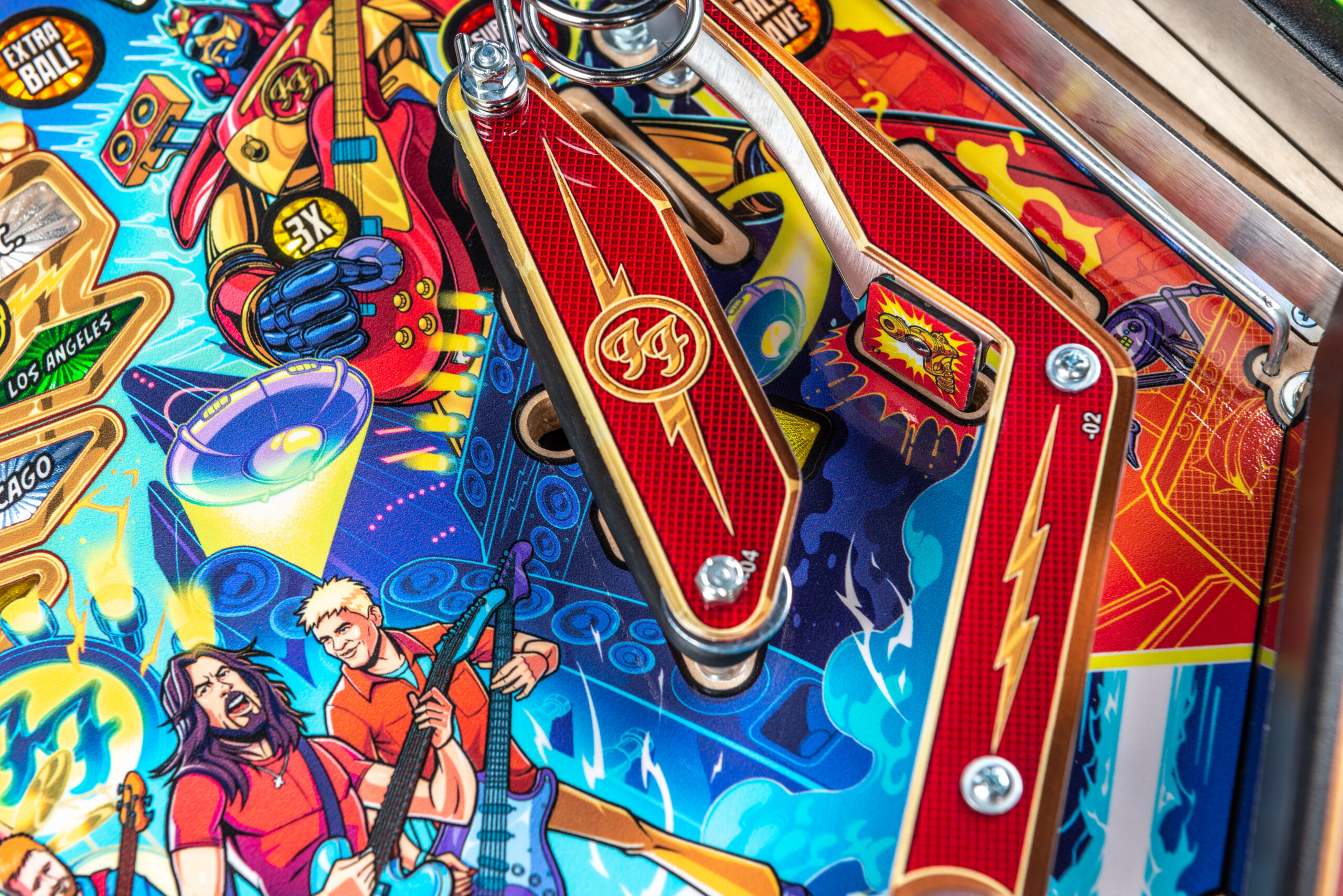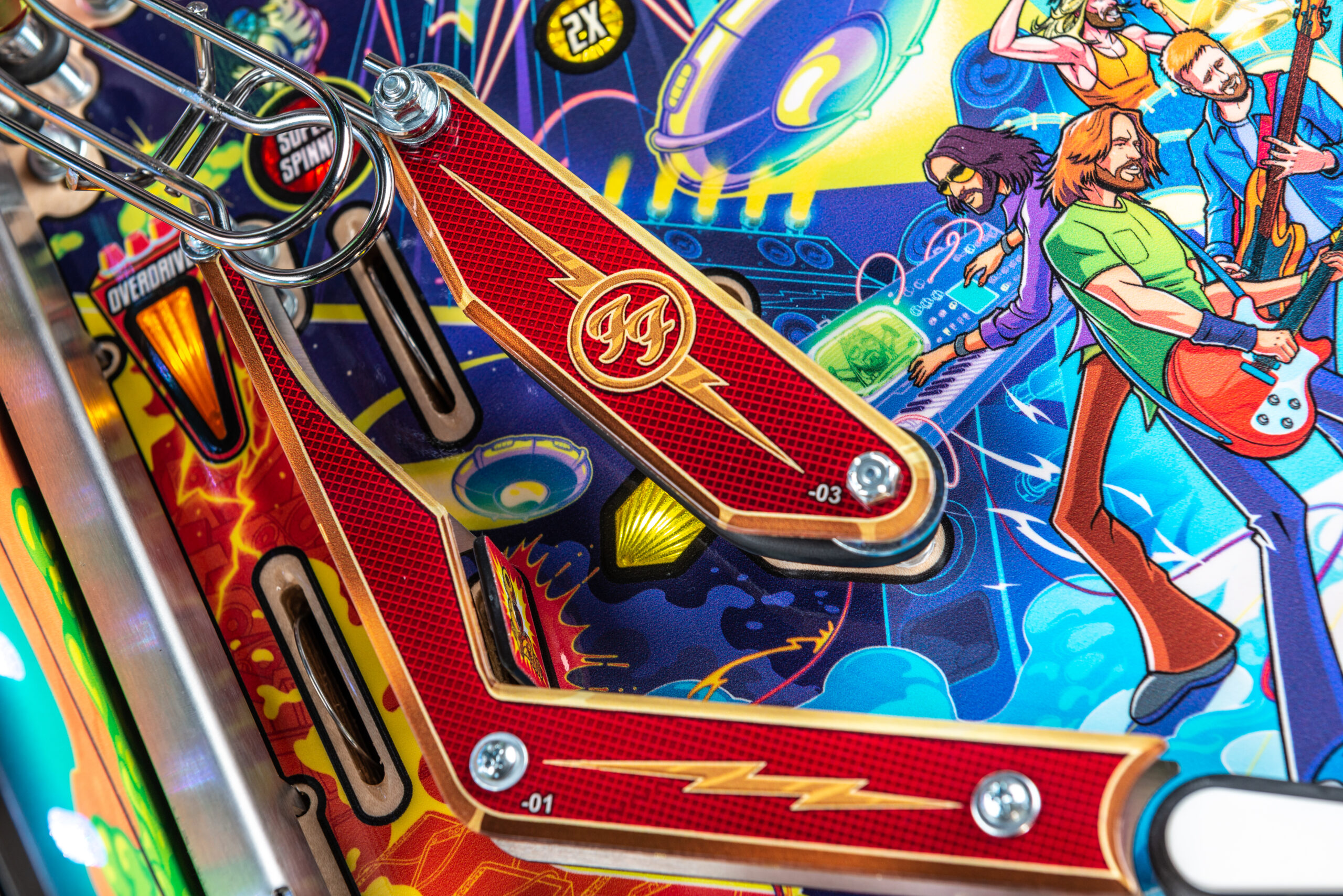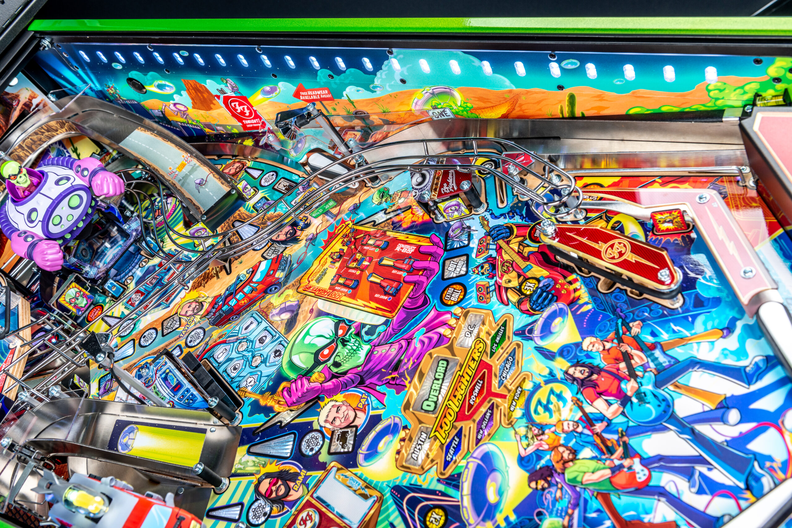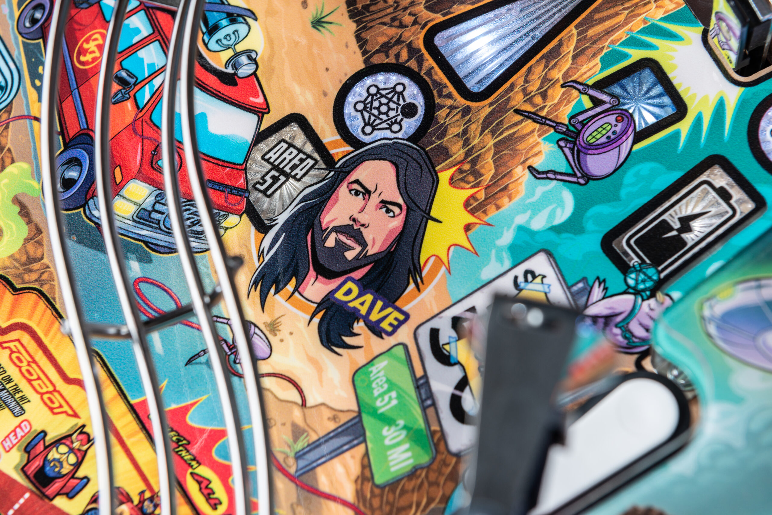More than two years in the making and with creative input from the band’s own Dave Grohl, Nate Mendel, Pat Smear, Chris Shiflett, Rami Jaffee, and the late, great Taylor Hawkins, Stern’s Foo Fighters is a top-shelf pinball machine—and so much more. An entire new universe has been developed with jaw-dropping hand-drawn artwork and custom animations including “Foo Fighters Saturday Morning Action Time!”—a fictional TV series chronicling the band’s quest to save rock and roll… AND THE WORLD!  Join Foo Fighters on this rescue mission to thwart the evil, mysterious alien Overlord and his army of bots.  Search the Area 51 upper playfield to break into and unleash pinball chaos.  Jump in the van for a righteous tour of duty to save humanity from extinction and let rock rule!