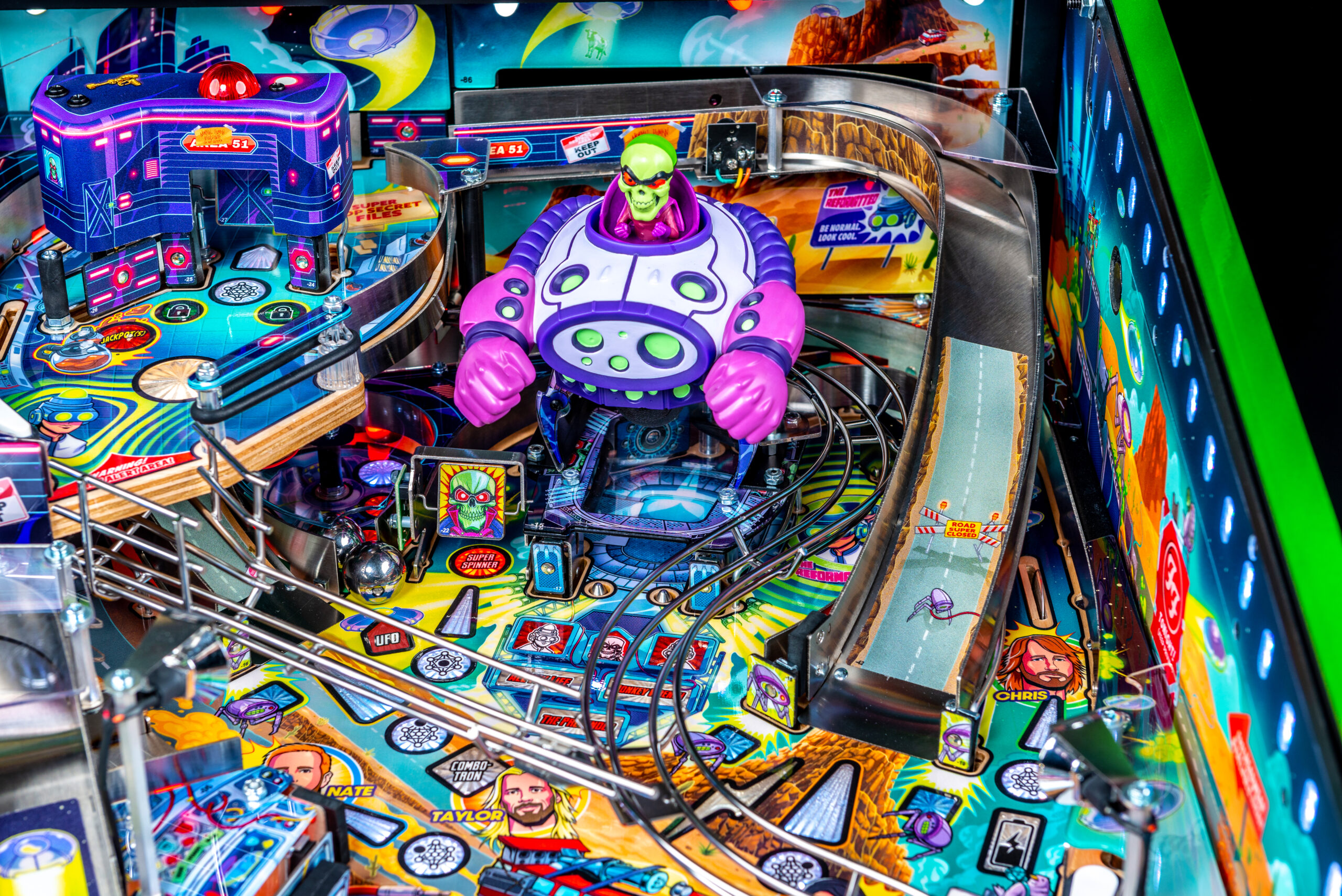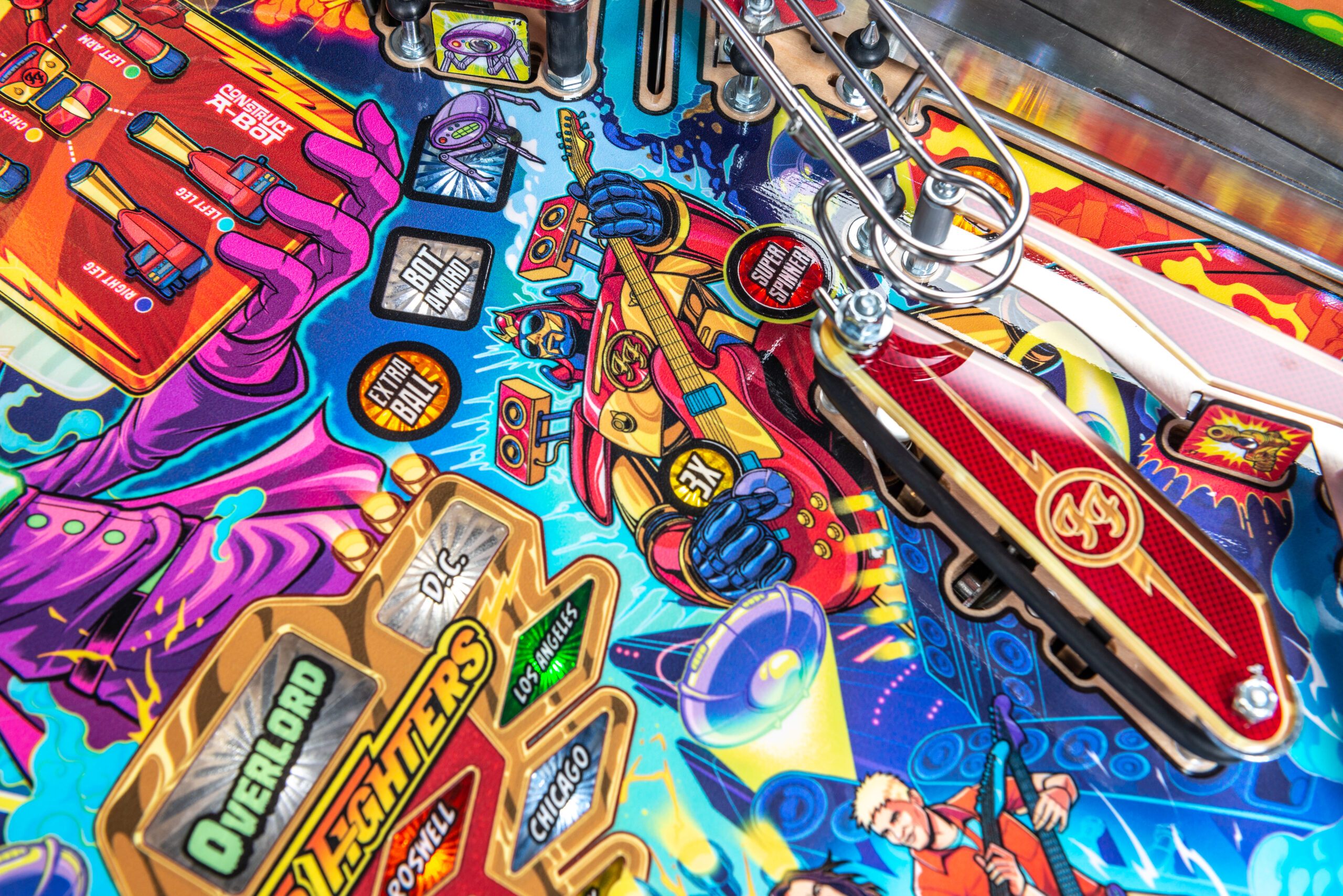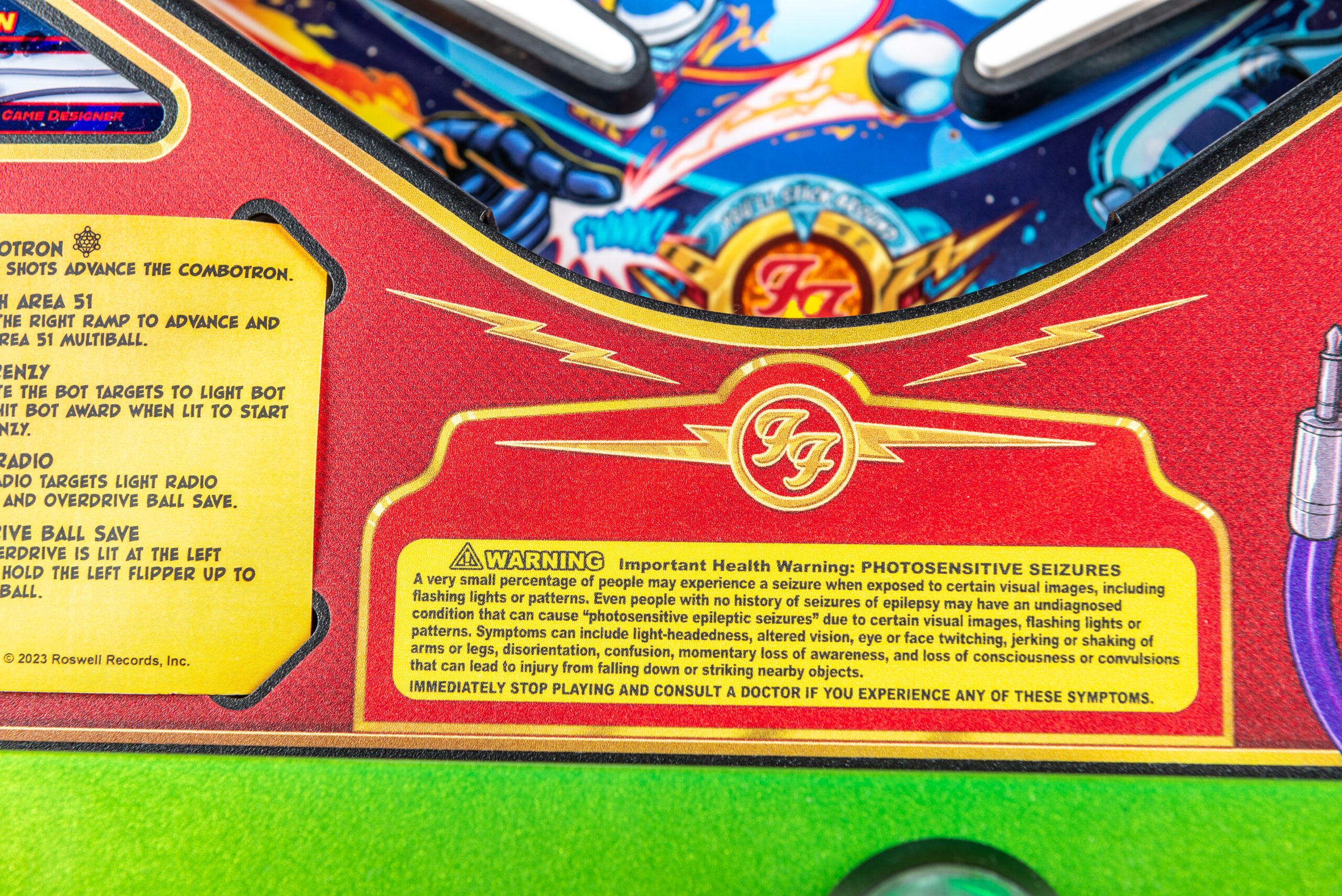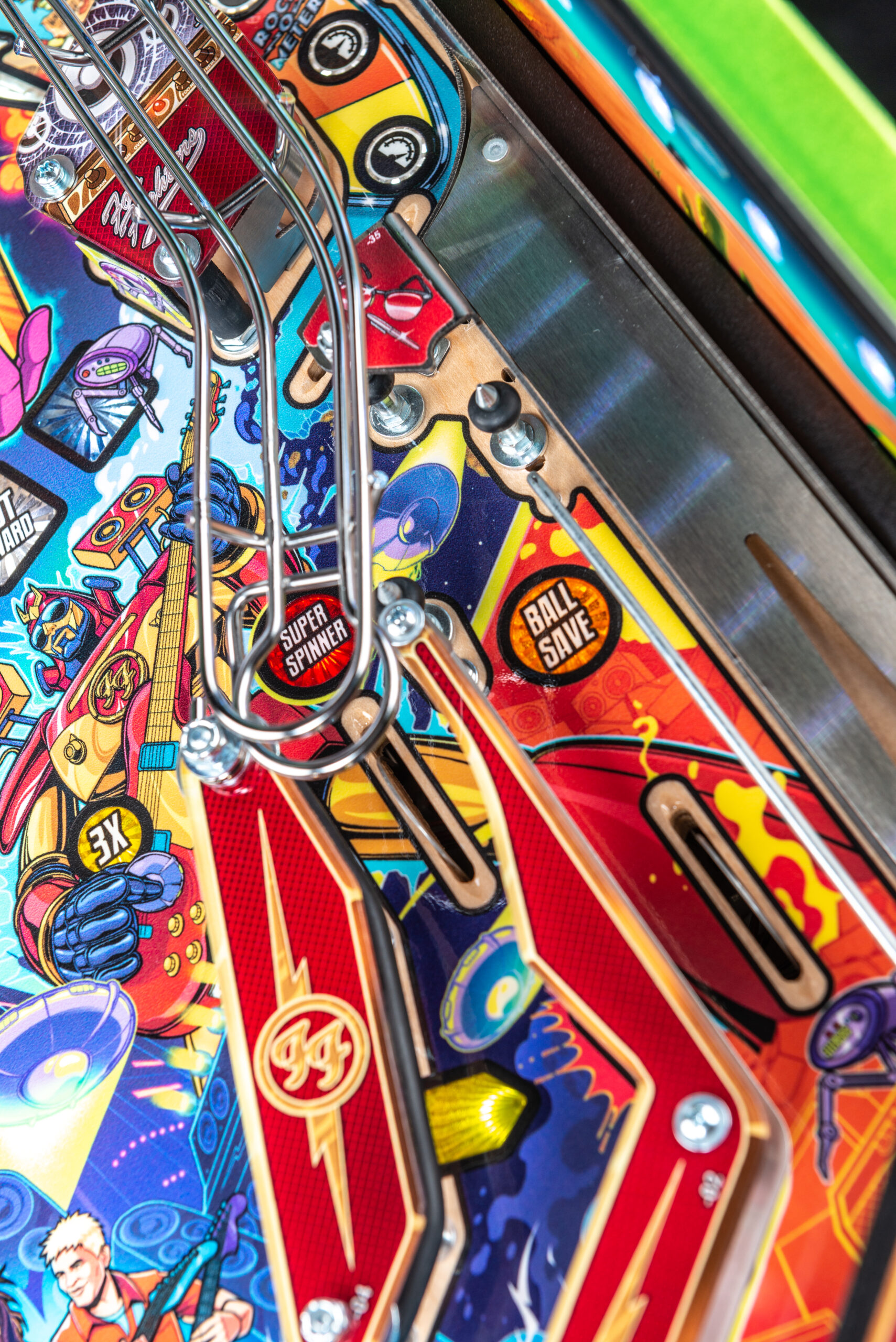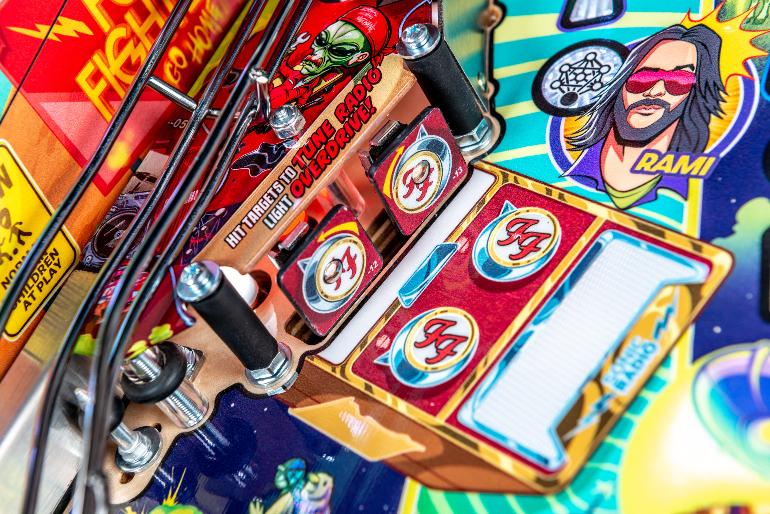 More than two years in the making and with creative input from the band’s own Dave Grohl, Nate Mendel, Pat Smear, Chris Shiflett, Rami Jaffee, and the late, great Taylor Hawkins, Stern’s Foo Fighters is a top-shelf pinball machine—and so much more. An entire new universe has been developed with jaw-dropping hand-drawn artwork and custom animations including “Foo Fighters Saturday Morning Action Time!”—a fictional TV series chronicling the band’s quest to save rock and roll… AND THE WORLD!  Join Foo Fighters on this rescue mission to thwart the evil, mysterious alien Overlord and his army of bots.  Search the Area 51 upper playfield to break into and unleash pinball chaos.  Jump in the van for a righteous tour of duty to save humanity from extinction and let rock rule!