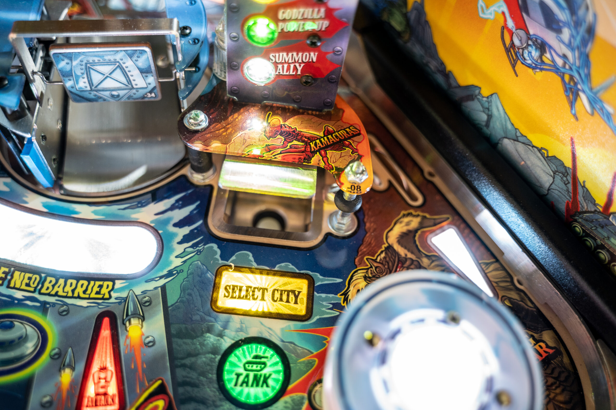 All models of Godzilla pinball machines feature an innovative “Magna Grab” magnetic newton ball, capable of catching pinballs from five different shot paths, including off the plunge. This device can also divert pinballs to set up shots from the upper left flipper. The game also includes the iconic title song “Godzilla” by Blue Oyster Cult, stunning hand-drawn artwork by Zombie Yeti, intricate wireform ramps, three spinning targets (Heat Ray, Mechagodzilla, and Monster Rampage), three flippers, three “powerline” themed stand-up targets and a UFO pop pumper. The game highlights video and audio from ten* Toho Showa Era Godzilla films to create a one-of-a-kind immersive Godzilla pinball experience.