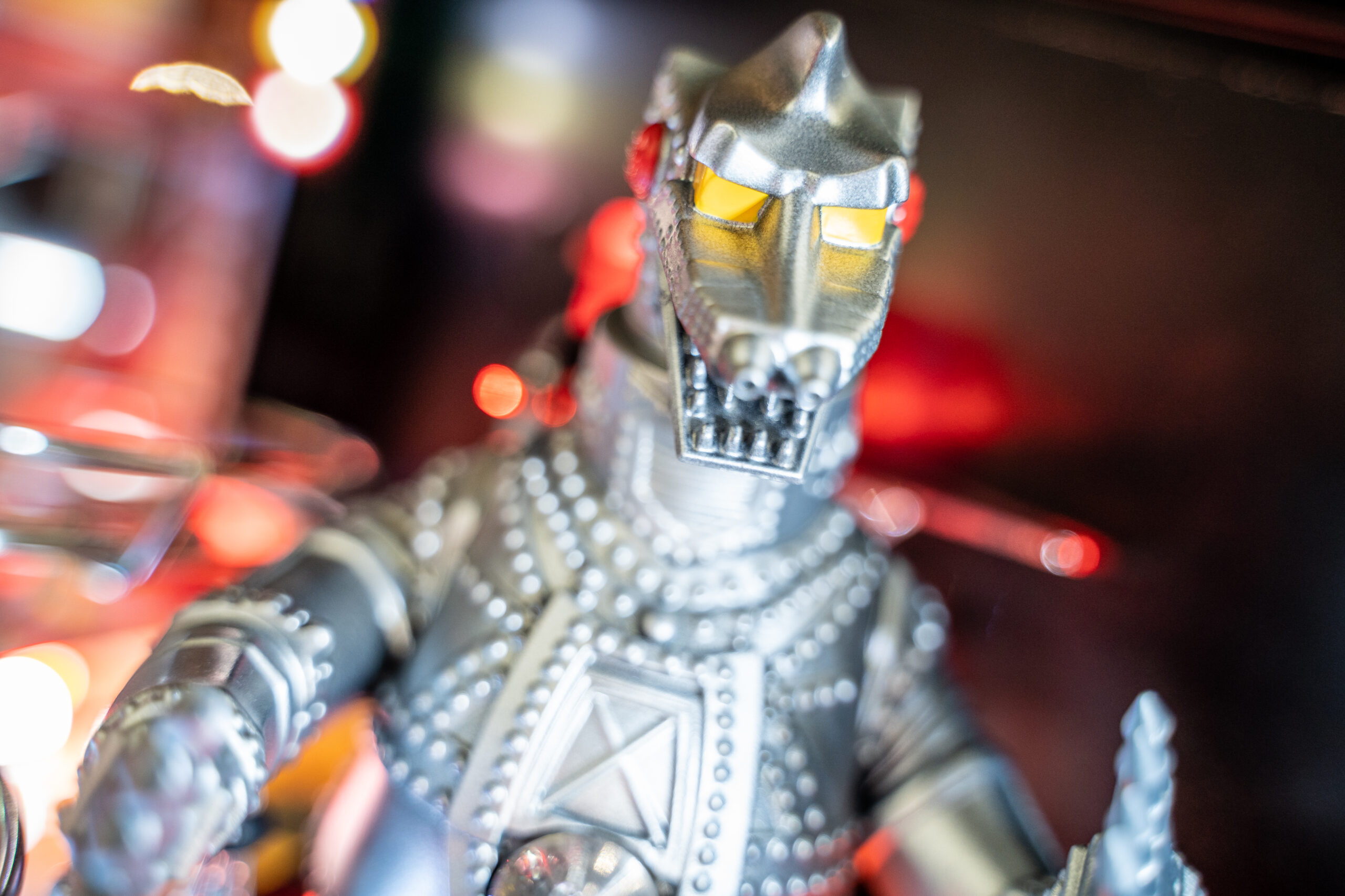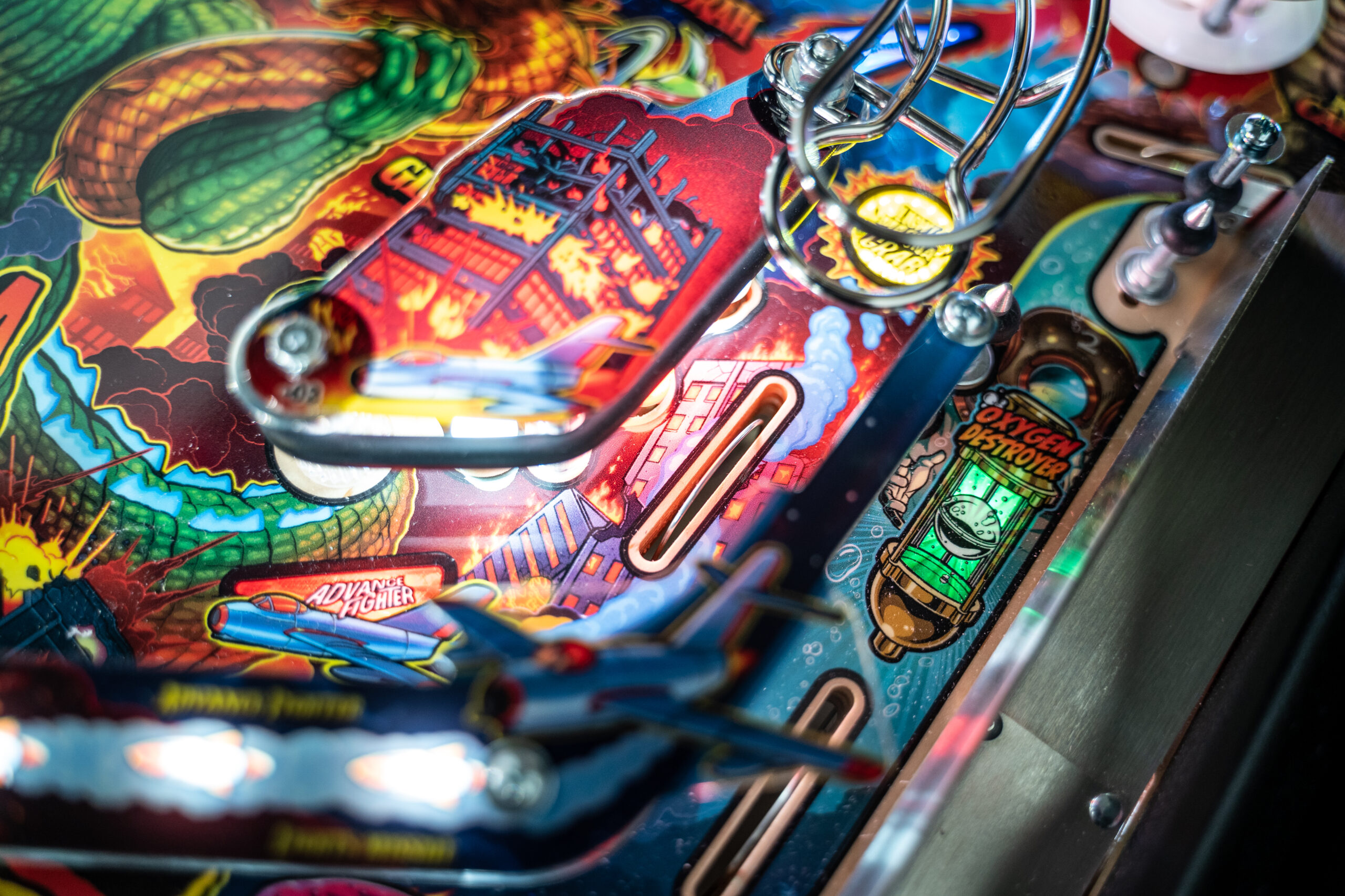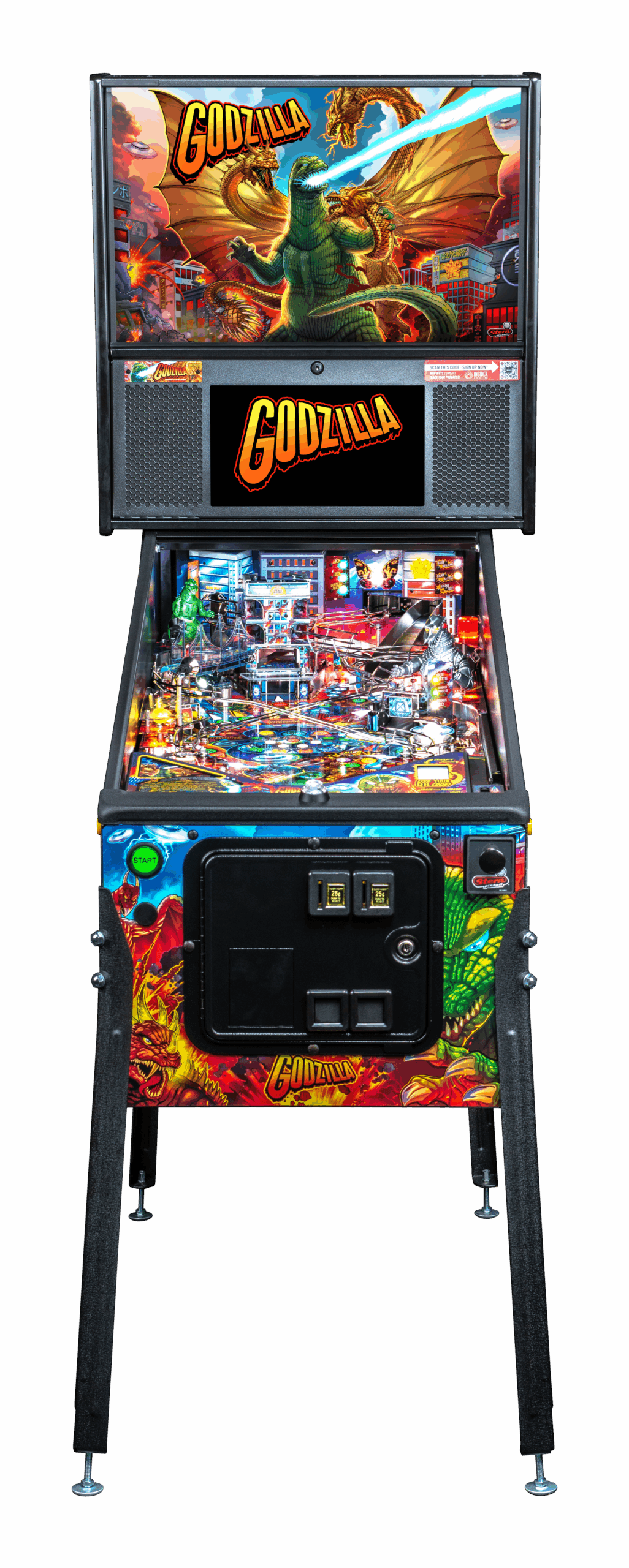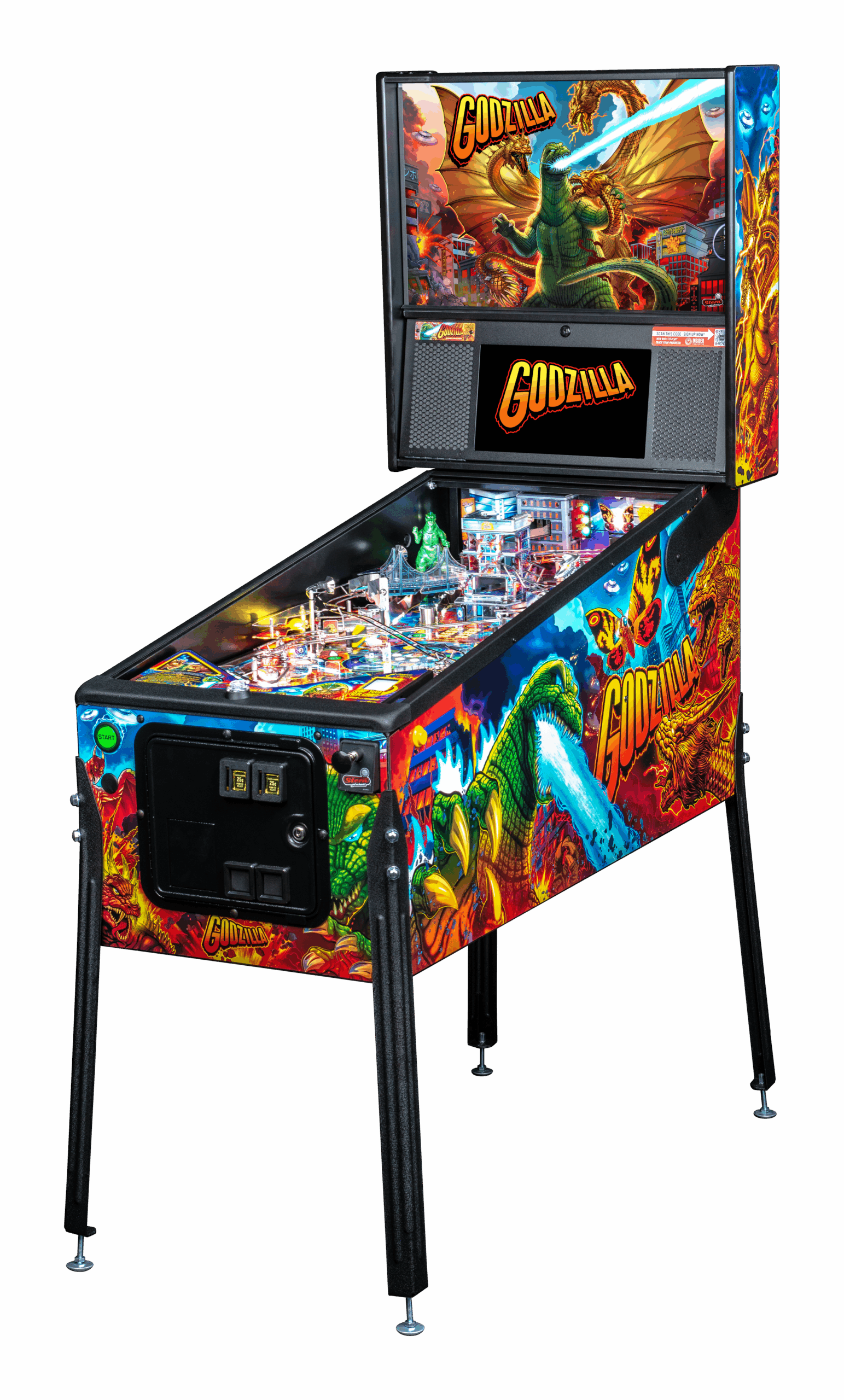 All models of Godzilla pinball machines feature an innovative “Magna Grab” magnetic newton ball, capable of catching pinballs from five different shot paths, including off the plunge. This device can also divert pinballs to set up shots from the upper left flipper. The game also includes the iconic title song “Godzilla” by Blue Oyster Cult, stunning hand-drawn artwork by Zombie Yeti, intricate wireform ramps, three spinning targets (Heat Ray, Mechagodzilla, and Monster Rampage), three flippers, three “powerline” themed stand-up targets and a UFO pop pumper. The game highlights video and audio from ten* Toho Showa Era Godzilla films to create a one-of-a-kind immersive Godzilla pinball experience.