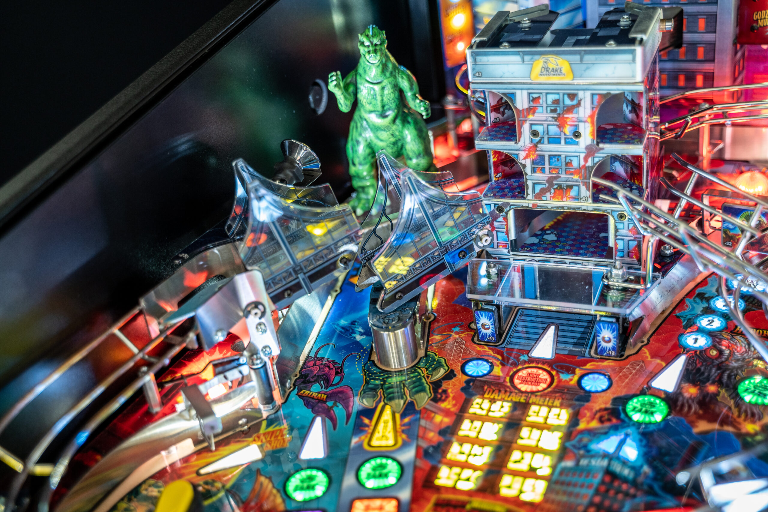Chaos and destruction ensue on the playfield with Godzilla multiball, started by shooting one of the various shots in and through the centrally located skyscraper. In the Premium and LE models, a motor actuates the skyscraper, diverting balls through each of its five stories as it collapses, ultimately locking three balls on its roof. The Premium/LE playfield also features a collapsing bridge ramp. This animated breakaway ramp is guarded by a custom molded Godzilla and can divert pinballs back to the flipper or directly onto the playfield during Bridge Attack multiball.