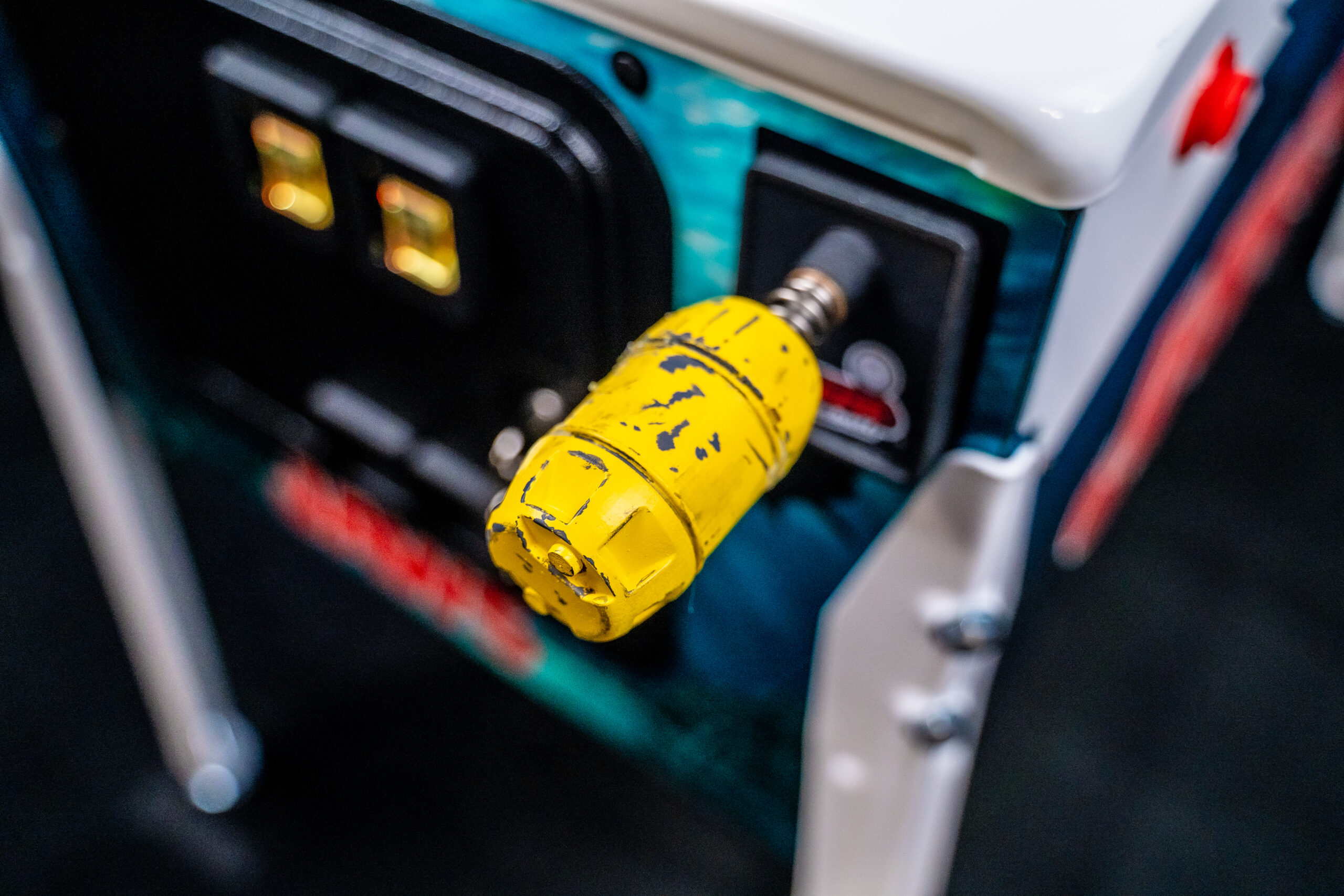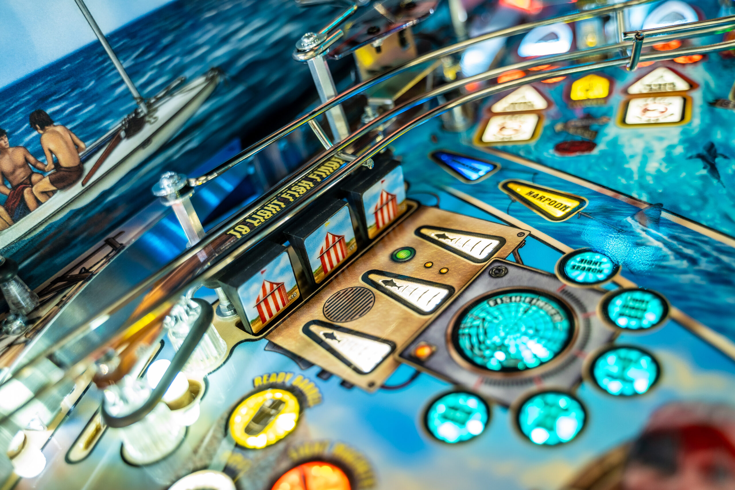 Stern’s JAWS pinball games will have players grabbing their harpoons and playing as Quint, Hooper, and Brody to save Amity Island’s residents and the Fourth of July! As the grizzled fishermen, tackle the most dangerous ocean creatures on the planet. Tension mounts as you see “blood in the water” from our animated lighting effects. Fire pinballs at the motorized “Shark Fin” target swimming across the playfield. Anticipation builds as you navigate the “Orca Boat” upper playfield, featuring a “Lookout Tower” ramp, a ship’s wheel horizontal spinner on the deck, and a “Radio” stand-up target to call for help. Lookout! A motorized custom sculpted “Great White Shark” bash toy comes crashing through the bottom of a fishing boat, terrorizing players in this thrilling pinball odyssey. Will you survive JAWS?!