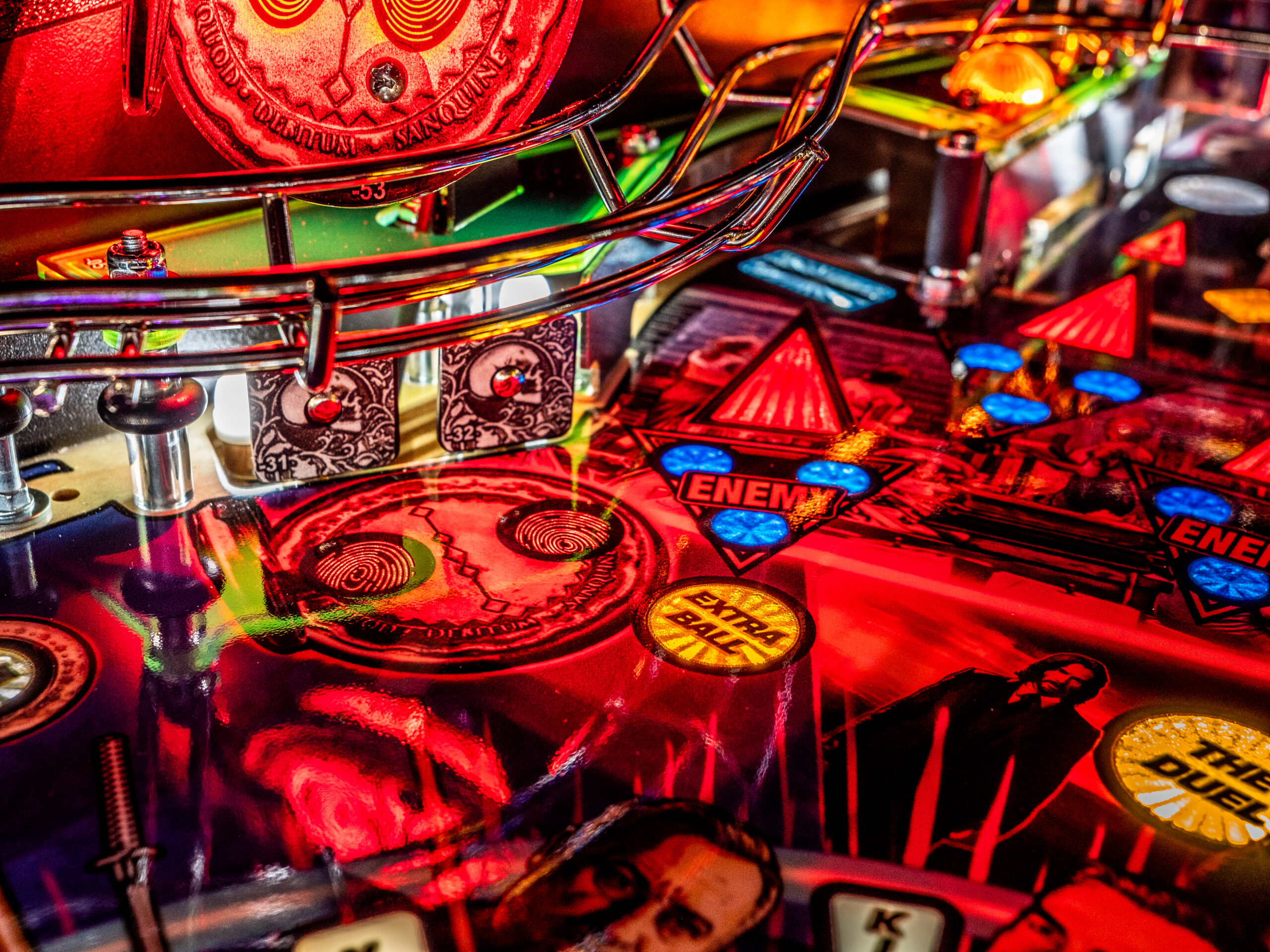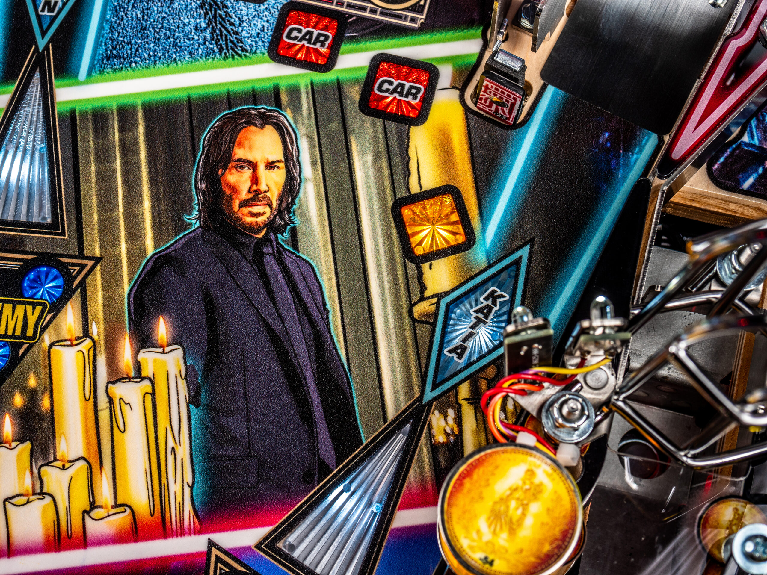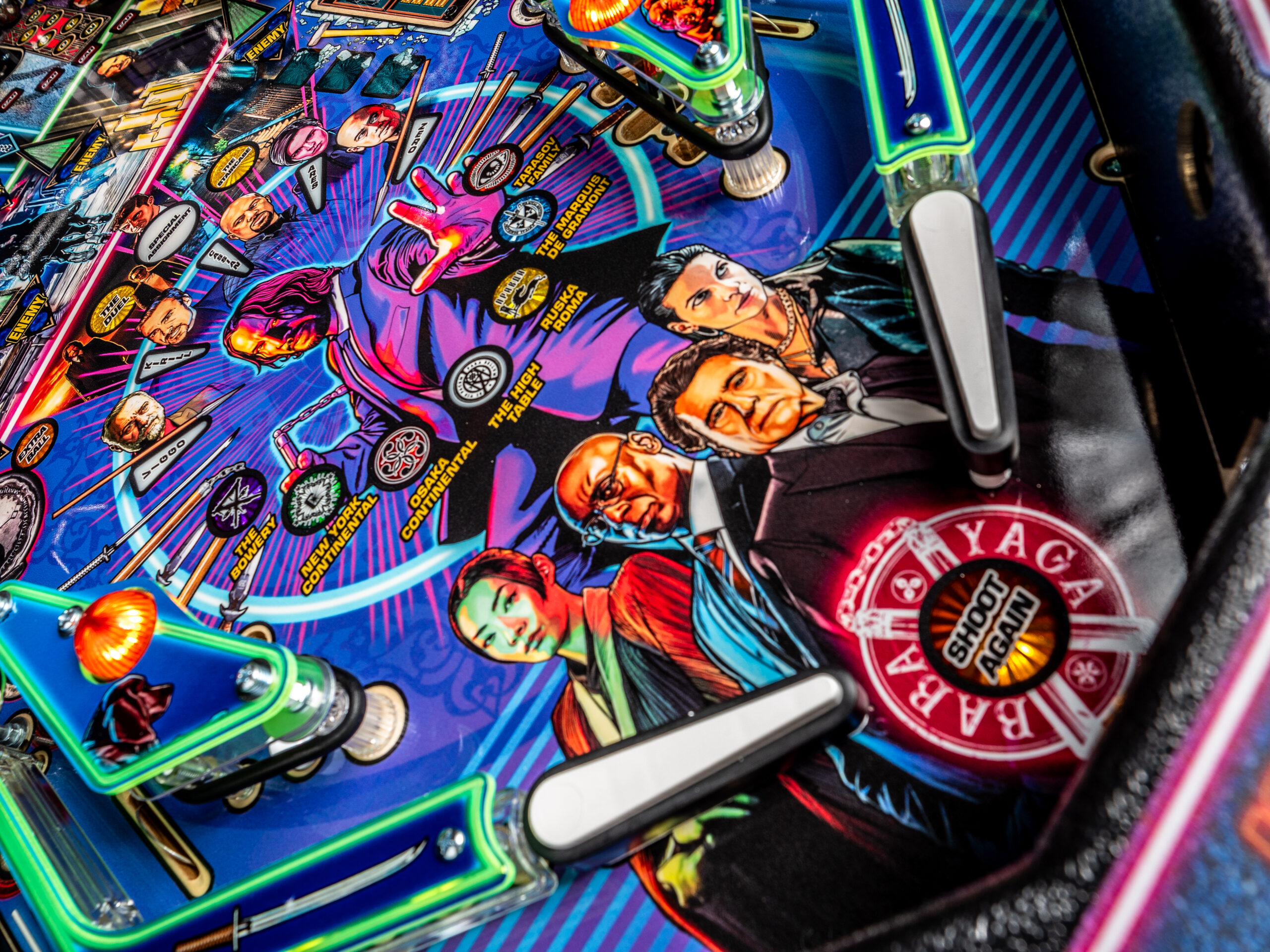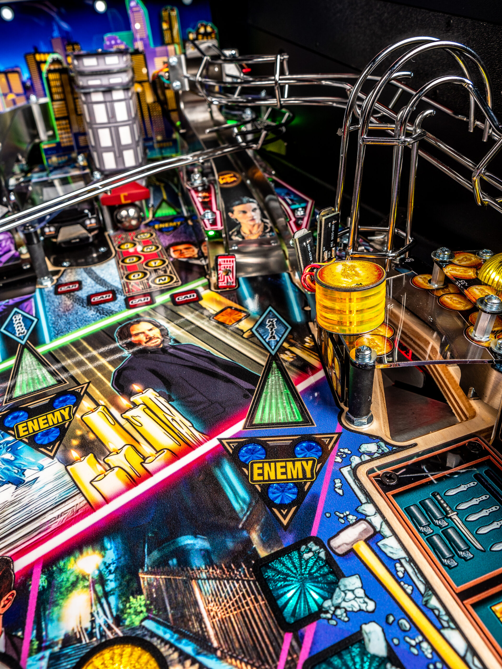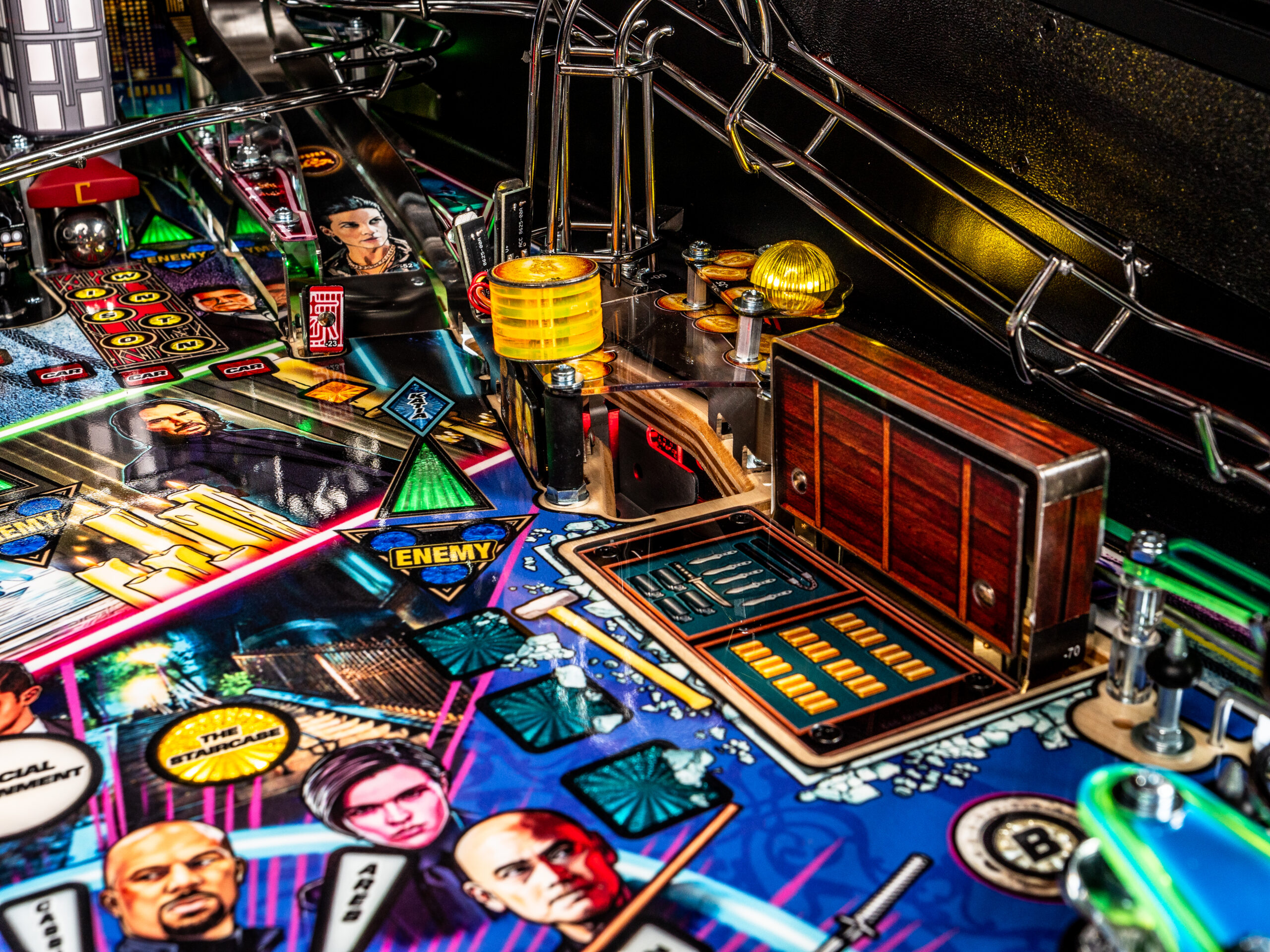 To raise the stakes, John Wick pinball introduces Stern’s all-new dynamic AI combat system, an innovation that brings the frenetic combat of the legendary films to the game. The Stern team has created a primitive video game AI system to control the enemy lights on the playfield, setting the John Wick pinball games apart from prior pinball machines, where all lights were controlled by player actions, timers, and random number generations. In this new AI combat system, enemy icons are responsive to player behavior and will illuminate dynamically around the playfield to challenge the player. The enemies move tactically with this dynamic software to counter player objectives, creating a unique challenge in each game session. The system also features a new action video player that dynamically reflects player action – as you defeat three enemies, you’ll see video clips of John Wick doing the same in the films!