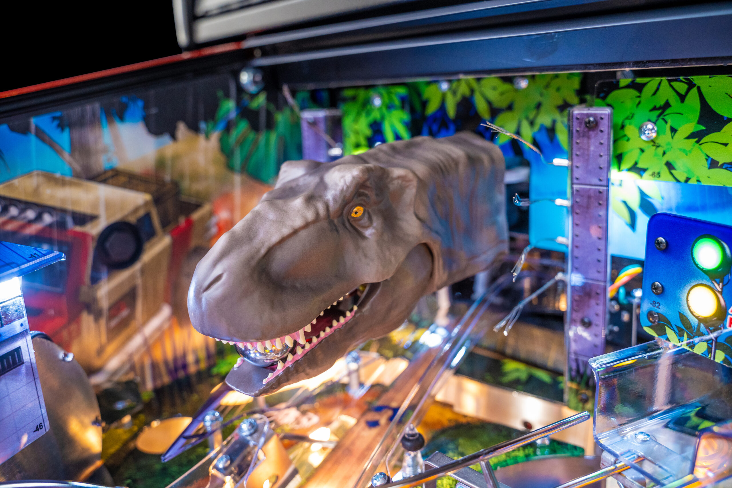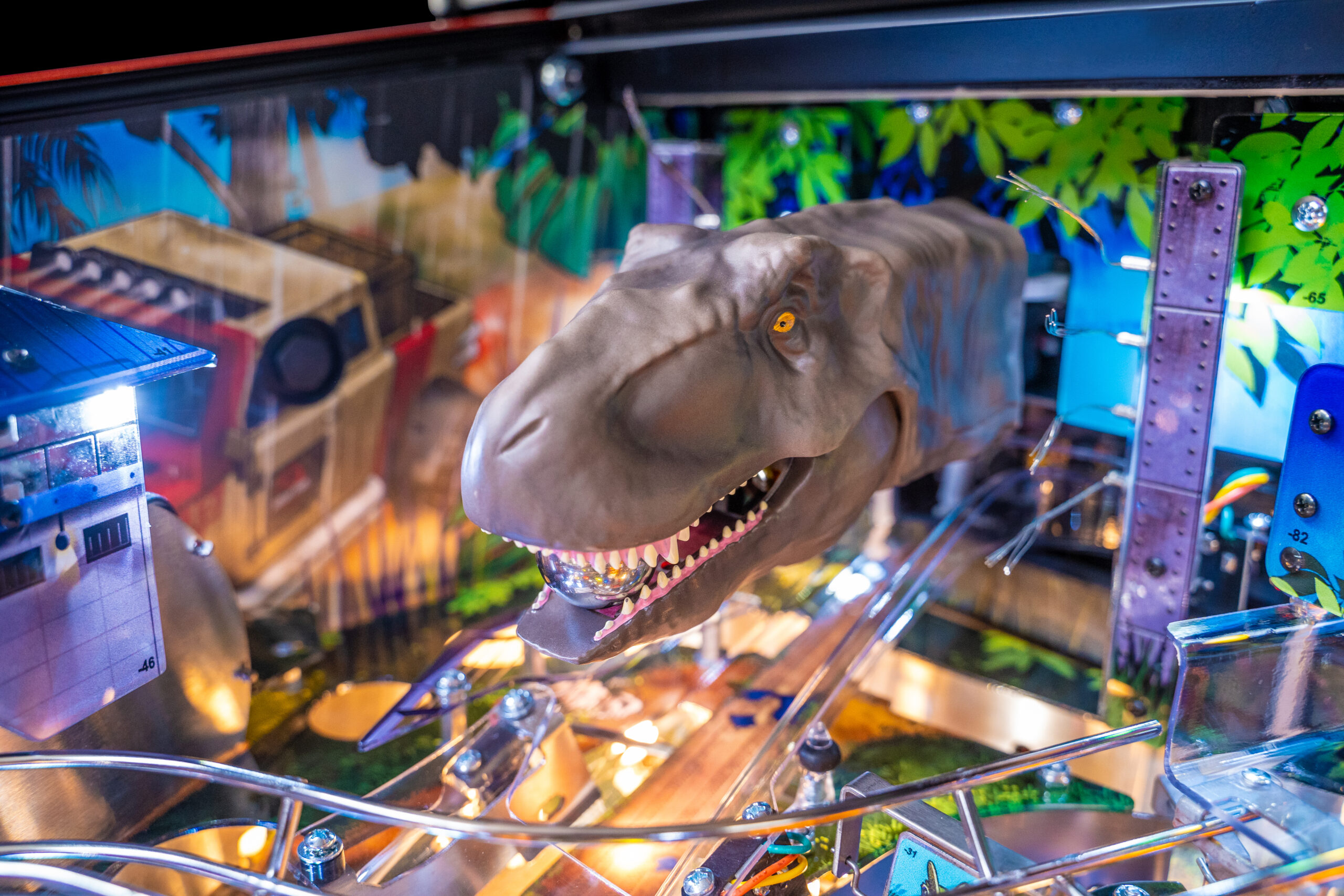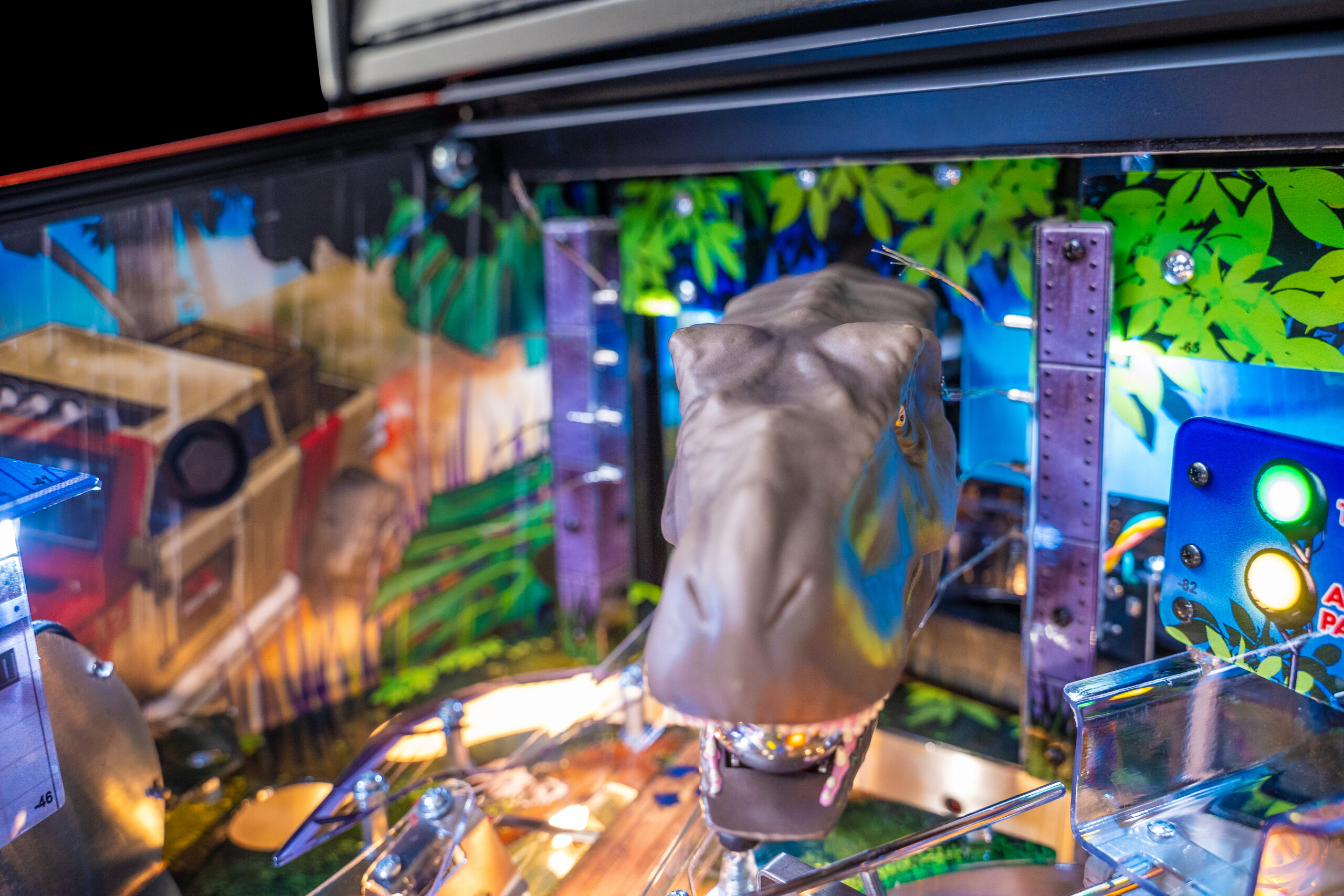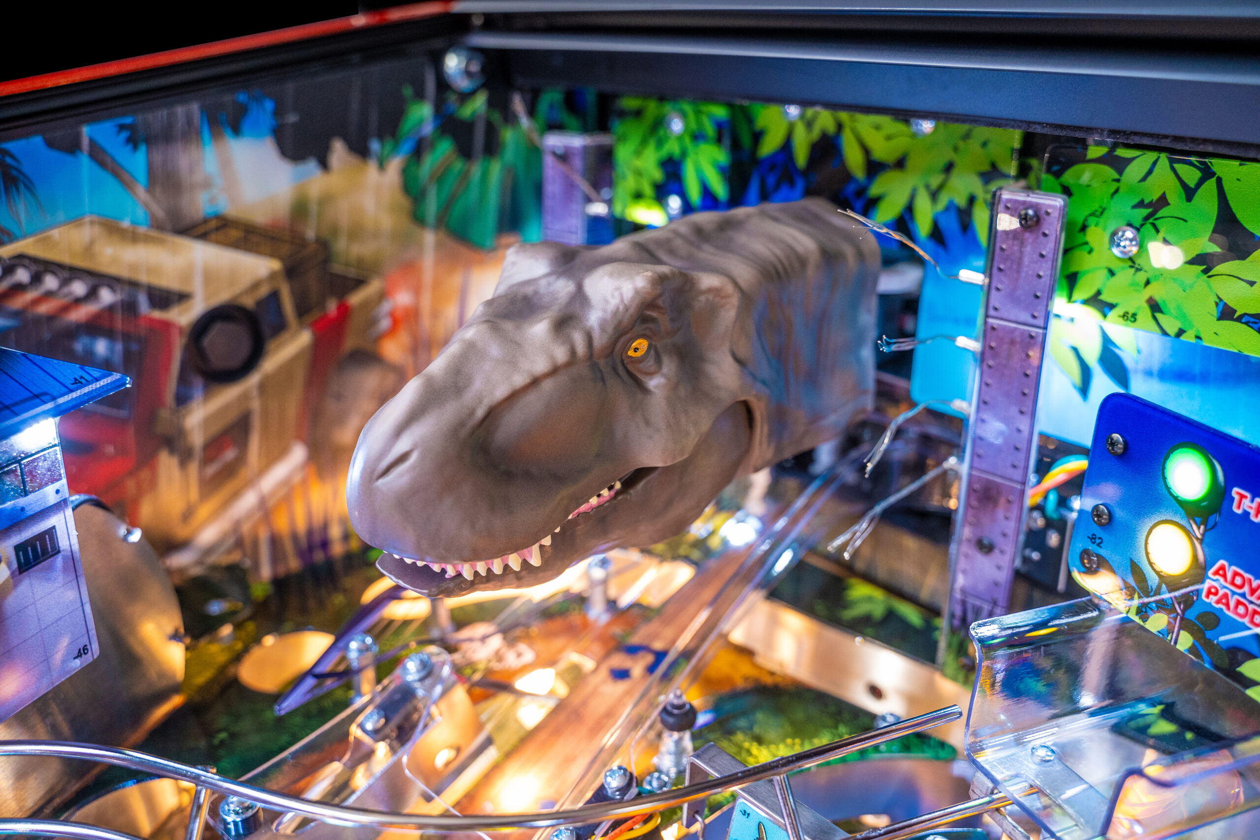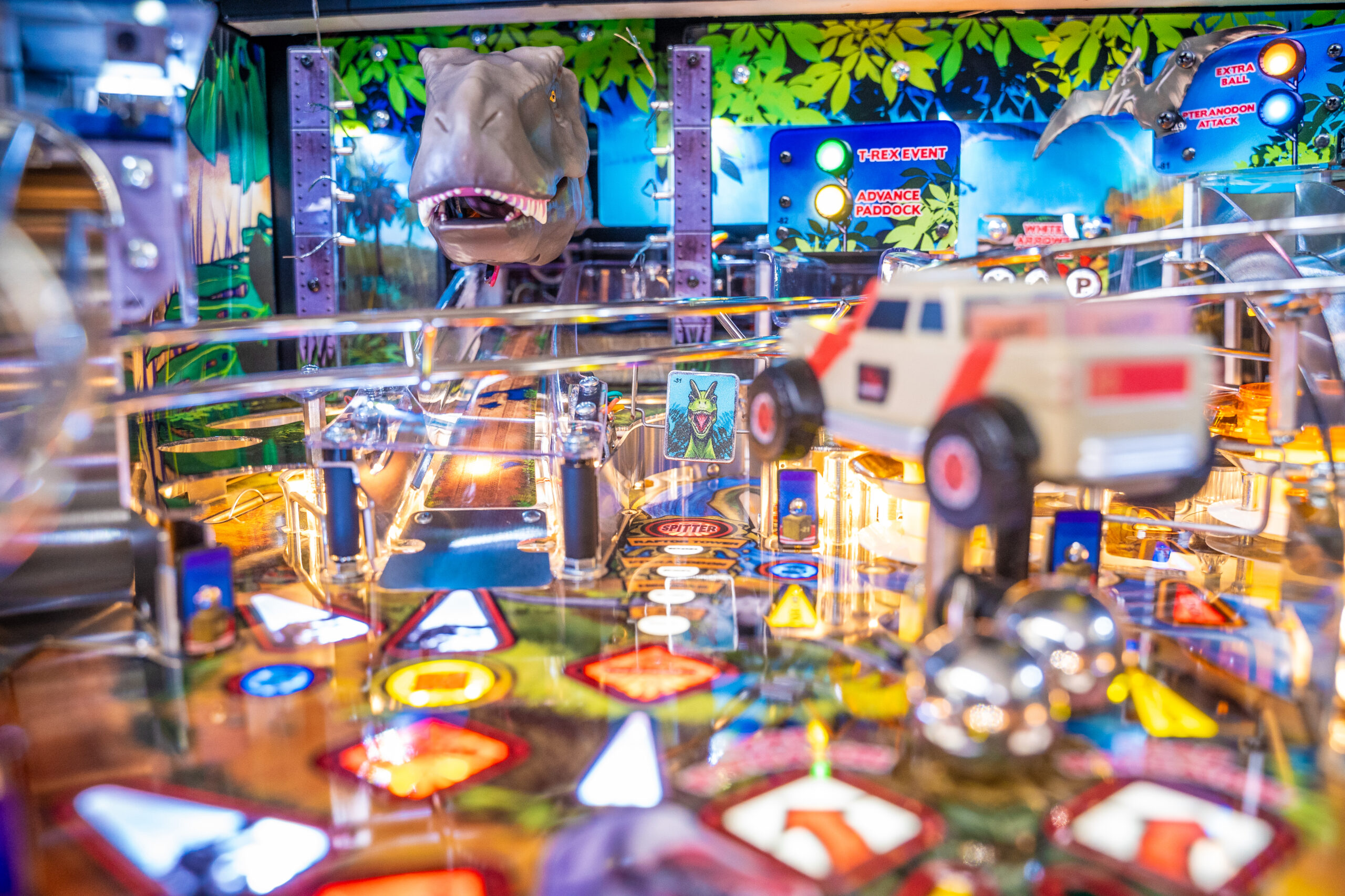 The Pro, Premium, and Limited Edition models also feature a Jungle Adventure Vehicle target in the middle of the playfield that is a spinning Newton Ball. This kinetic target registers direct hits, determines the direction players navigate on the island during gameplay, and lights T. Rex modes. All models include three full sized flippers, four custom ramps, a spinning “Spitter” target, in-lane up/down lock post that sets up critical playfield shots and distinctive hand-drawn art highlighting iconic dinosaurs from the series.