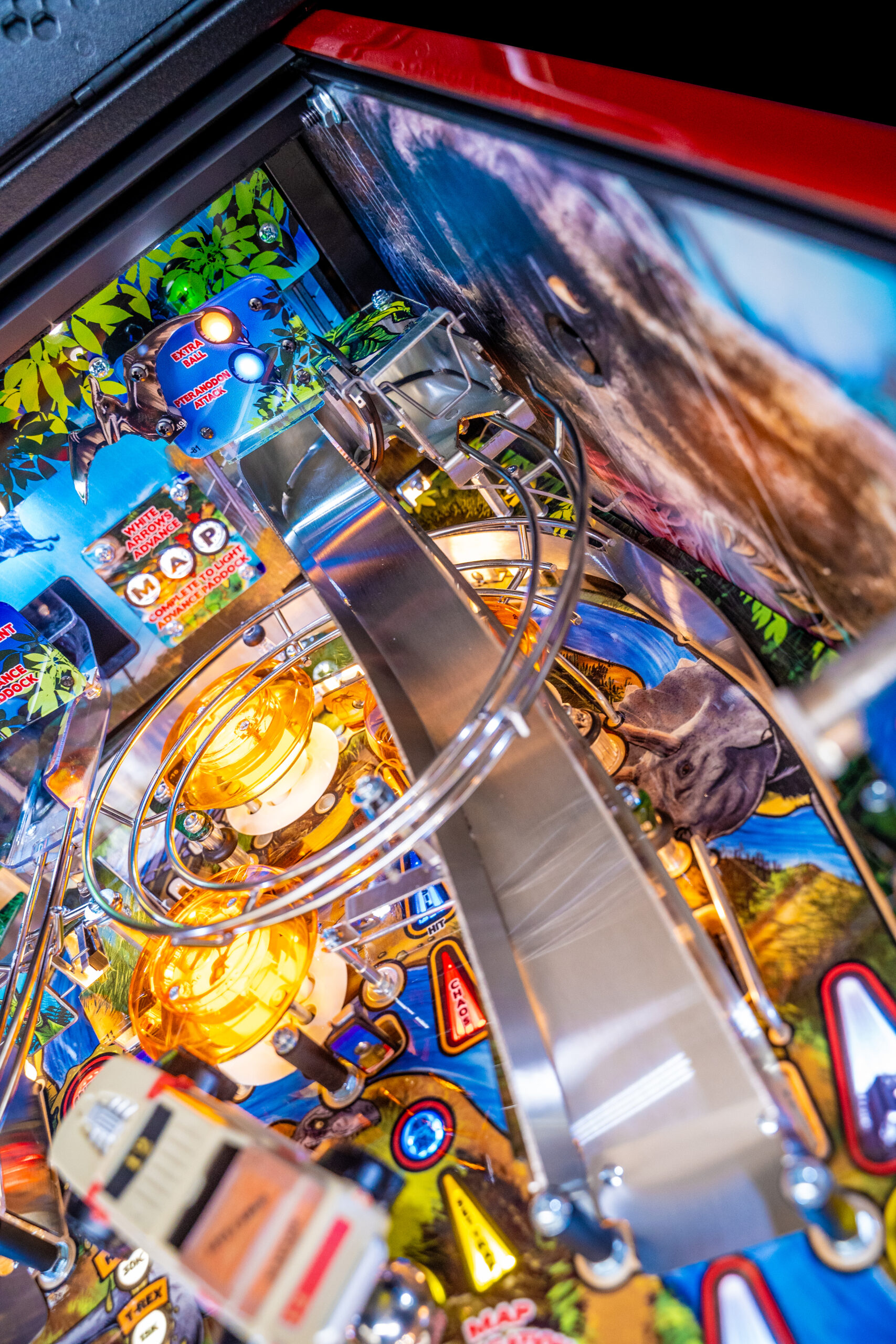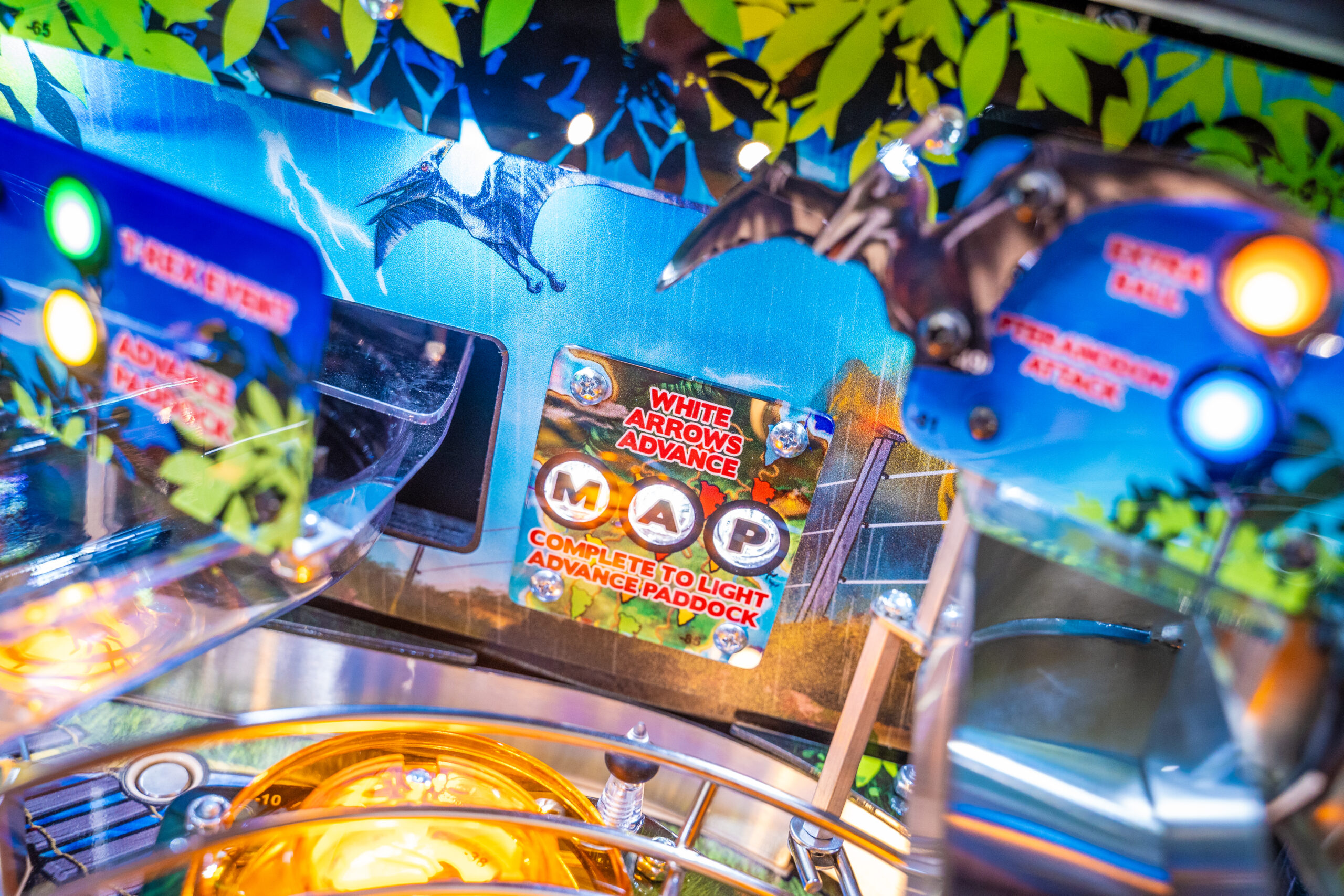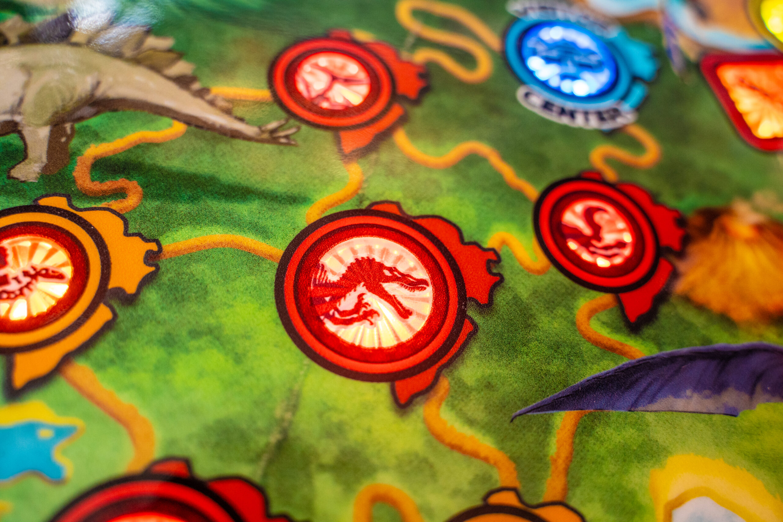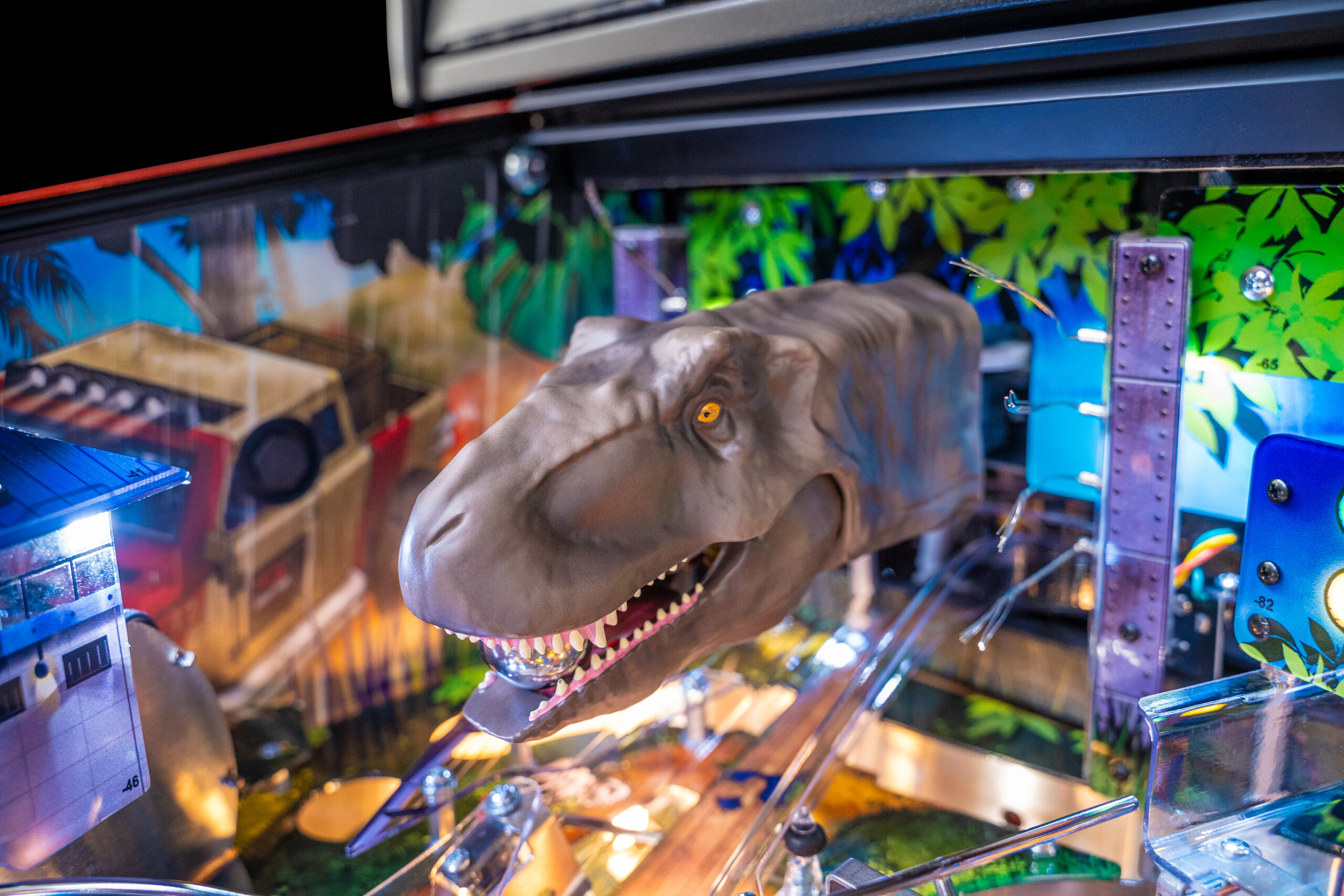 The Pro, Premium, and Limited Edition models also feature a Jungle Adventure Vehicle target in the middle of the playfield that is a spinning Newton Ball. This kinetic target registers direct hits, determines the direction players navigate on the island during gameplay, and lights T. Rex modes. All models include three full sized flippers, four custom ramps, a spinning “Spitter” target, in-lane up/down lock post that sets up critical playfield shots and distinctive hand-drawn art highlighting iconic dinosaurs from the series.