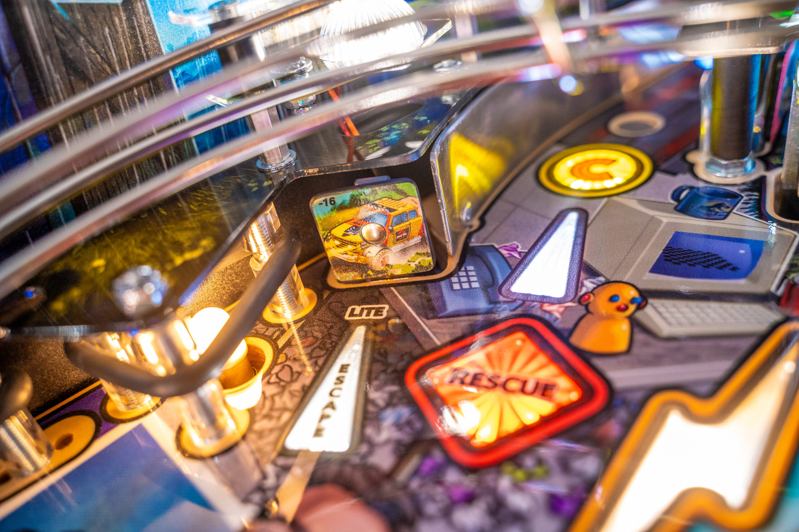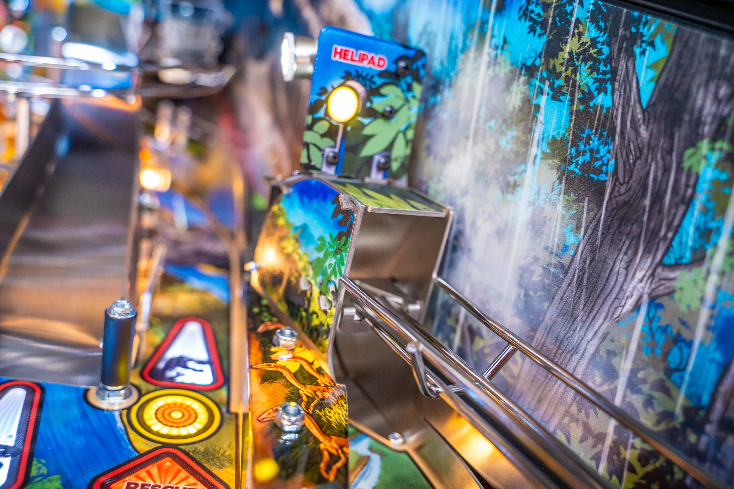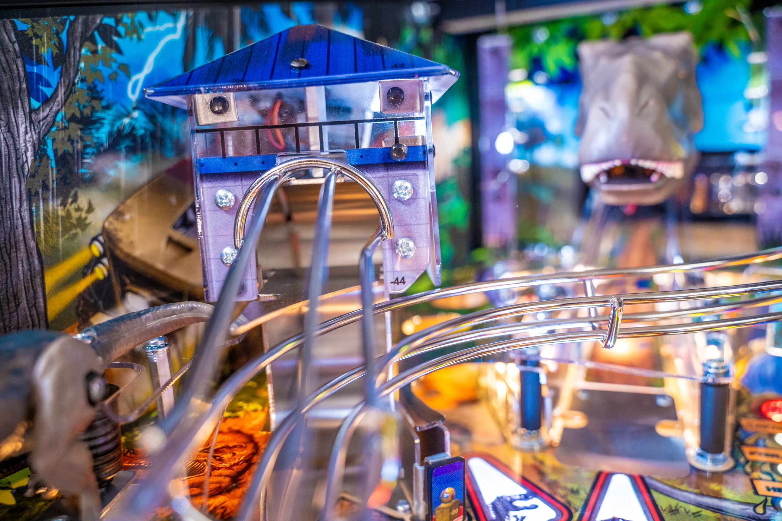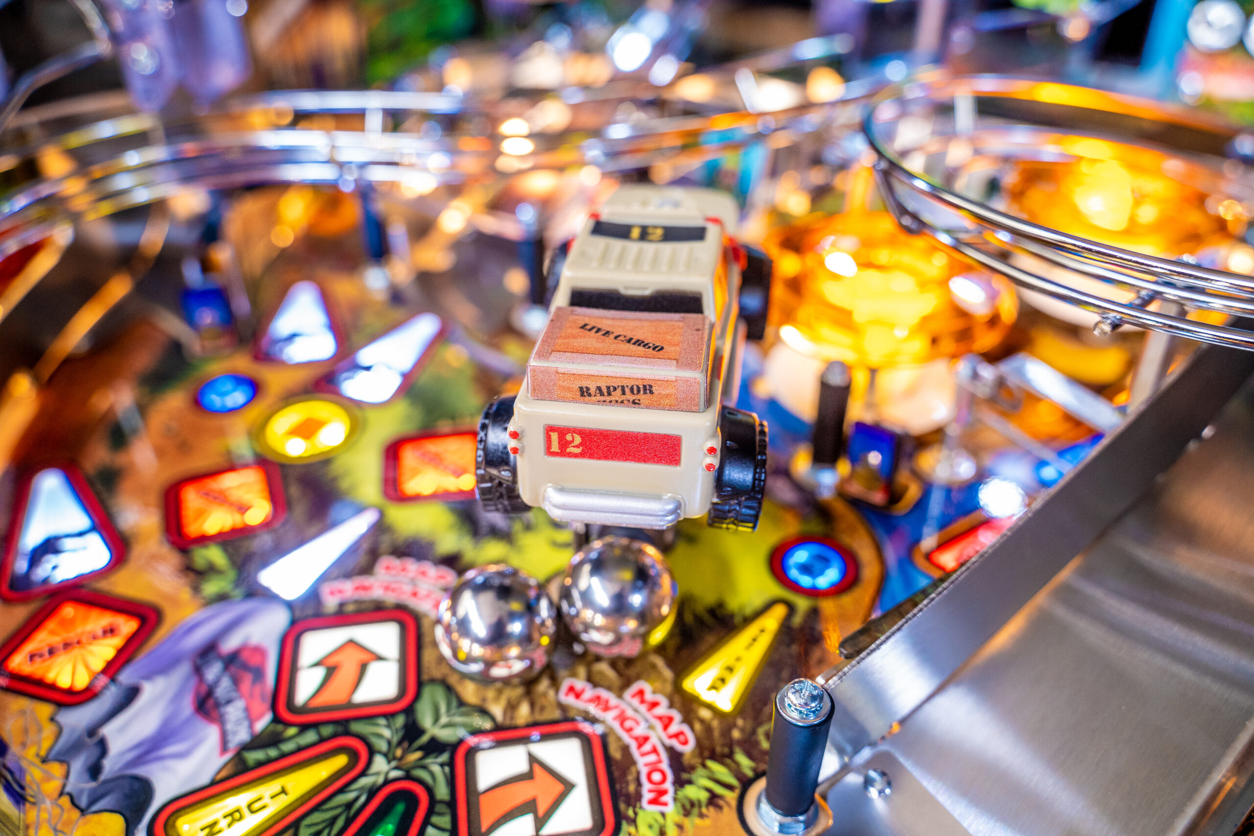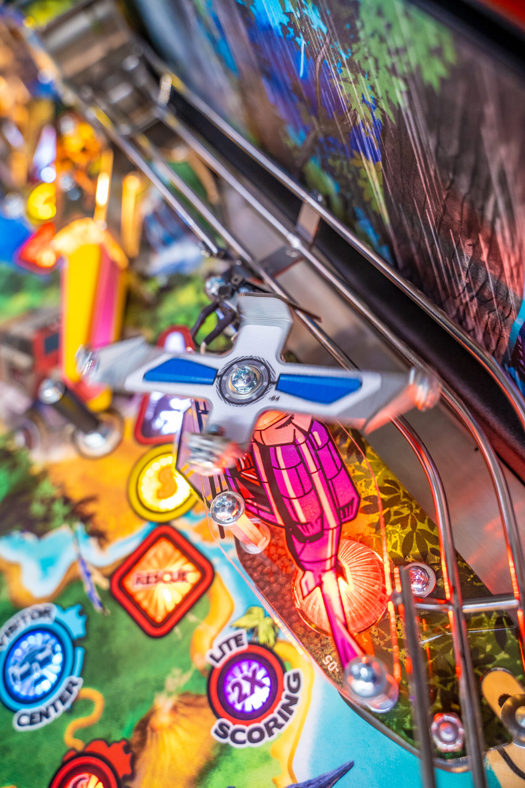The Pro, Premium, and Limited Edition models also feature a Jungle Adventure Vehicle target in the middle of the playfield that is a spinning Newton Ball. This kinetic target registers direct hits, determines the direction players navigate on the island during gameplay, and lights T. Rex modes. All models include three full sized flippers, four custom ramps, a spinning “Spitter” target, in-lane up/down lock post that sets up critical playfield shots and distinctive hand-drawn art highlighting iconic dinosaurs from the series.