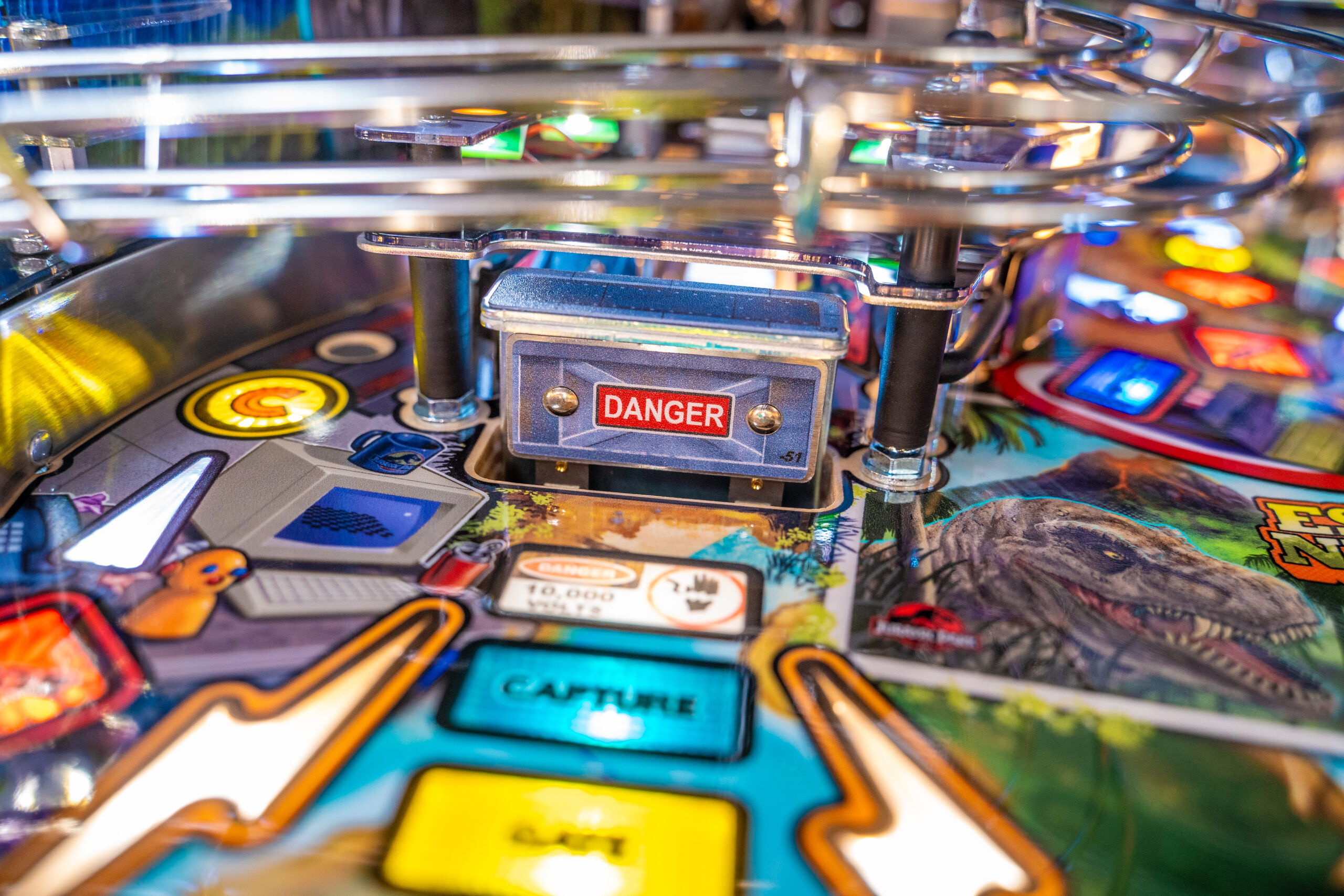 Like the blockbuster movie, the Jurassic Park pinball experience generates heart pounding excitement as the player progresses through the game. As the game starts, the player is transported to Isla Nublar, an amusement park where escaped dinosaurs are running amok! The player’s mission is to rescue park staff and recapture dinosaurs from the chaotic environment unleashed by Dennis Nedry’s computer virus. All dinosaurs, however, are not created equal as players will battle Raptors and the mighty T. Rex! The game immerses players in the fun world of battling dinosaurs in an action-packed adventure filled with twists and turns.