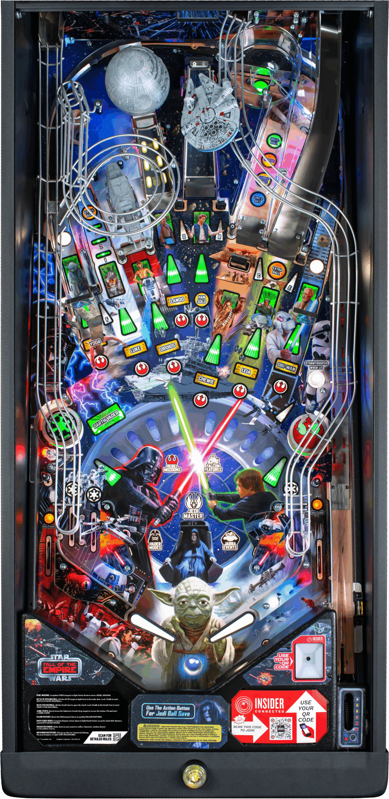 In Stern Pinball’s Star Wars: Fall of the Empire pinball games; players will take part in the adventures that started it all and experience iconic Star Wars-inspired moments through a pinball experience like no other. Players will take down the AT-AT by attaching their snowspeeder’s tow cable and shooting the spiral ramp to send it crashing down, mirroring the breathtaking scene from Star Wars: The Empire Strikes Back. Destroy the Death Star II from Star Wars: Return of the Jedi by lowering shields on the battle station during Death Star Multiball to save the galaxy. Players can also escape from Cloud City when reactivating the Millennium Falcon’s hyperdrive by hitting the center jump ramp to escape to hyperspace. Throughout the pinball experience, players will enter Jabba the Hutt’s Sarlacc Pit, battle stormtroopers, defeat TIE fighters, and even mimic using the Force to save your ball on the journey to defeating the Empire. Feel the power of the dark side as you enjoy special Darth Vader-inspired modes.